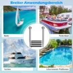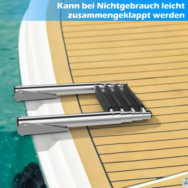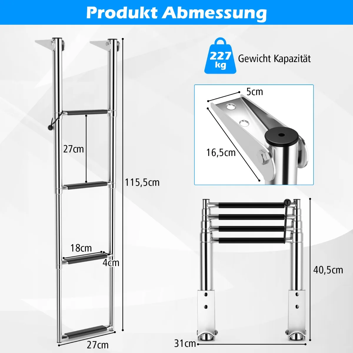 Kopėčios baseinui 31×115,5 cm sidabrinės spalvos – teleskopinės kopėčios, skirtos patogiam ir saugiam įlipimui bei išlipimui iš baseino ar valties. Pagamintos iš nerūdijančio plieno, jos atsparios korozijai ir tinka įvairioms vandens transporto priemonėms.