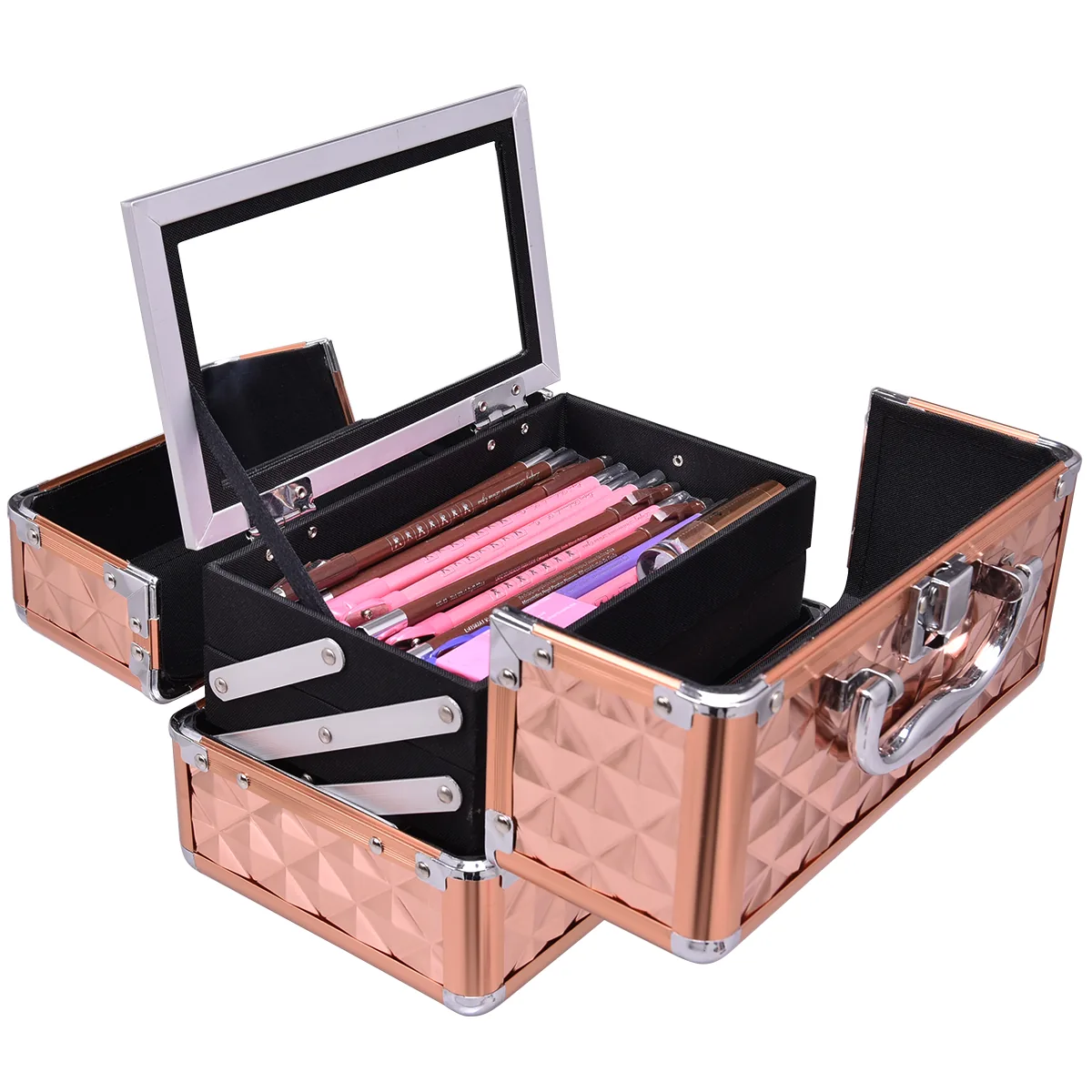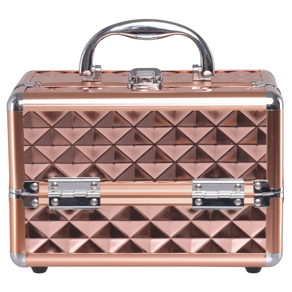 Kosmetikos lagaminas 23x15x18 cm, auksinės arba sidabrinės spalvos, skirtas saugoti ir tvarkingai laikyti jūsų kosmetiką bei grožio priemones. Dėklas turi patogią konstrukciją su dviem ištraukiamais padėklais, leidžiančiais lengvai organizuoti daiktus ir išlaikyti darbo vietą švarią. Lagaminas puikiai tinka tiek namams, tiek kelionėms.