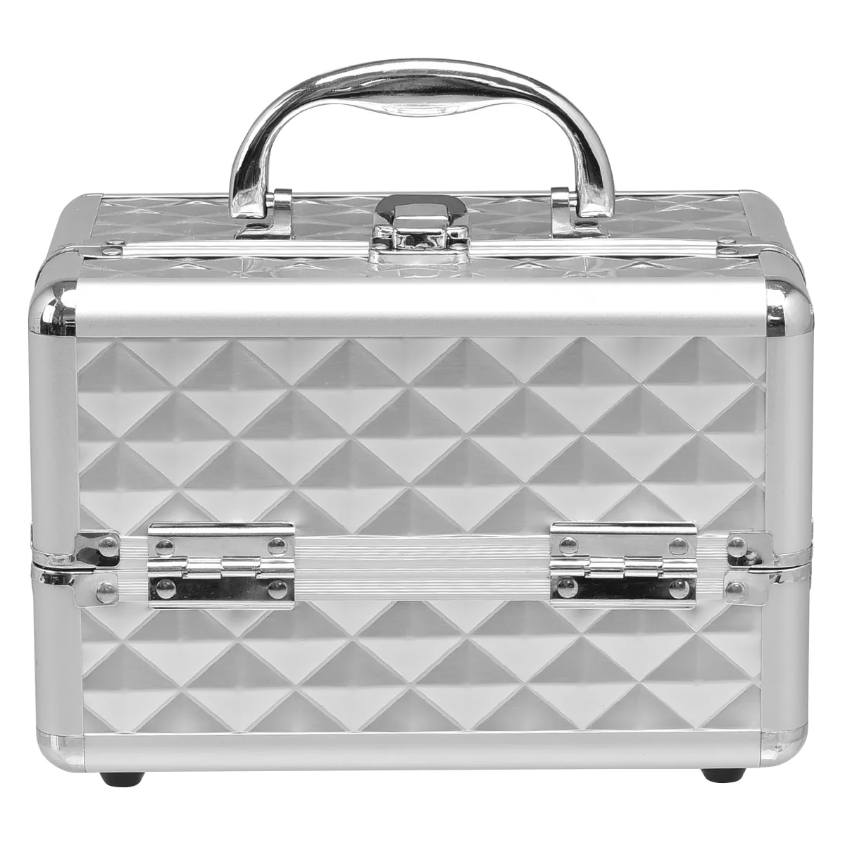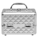 Kosmetikos lagaminas 23x15x18 cm sidabrinės spalvos – praktiškas dėklas kosmetikai, papuošalams ir smulkiems daiktams laikyti. Jo kompaktiški matmenys ir patogi rankena leidžia patogiai nešiotis kosmetiką tiek namuose, tiek kelionėse.