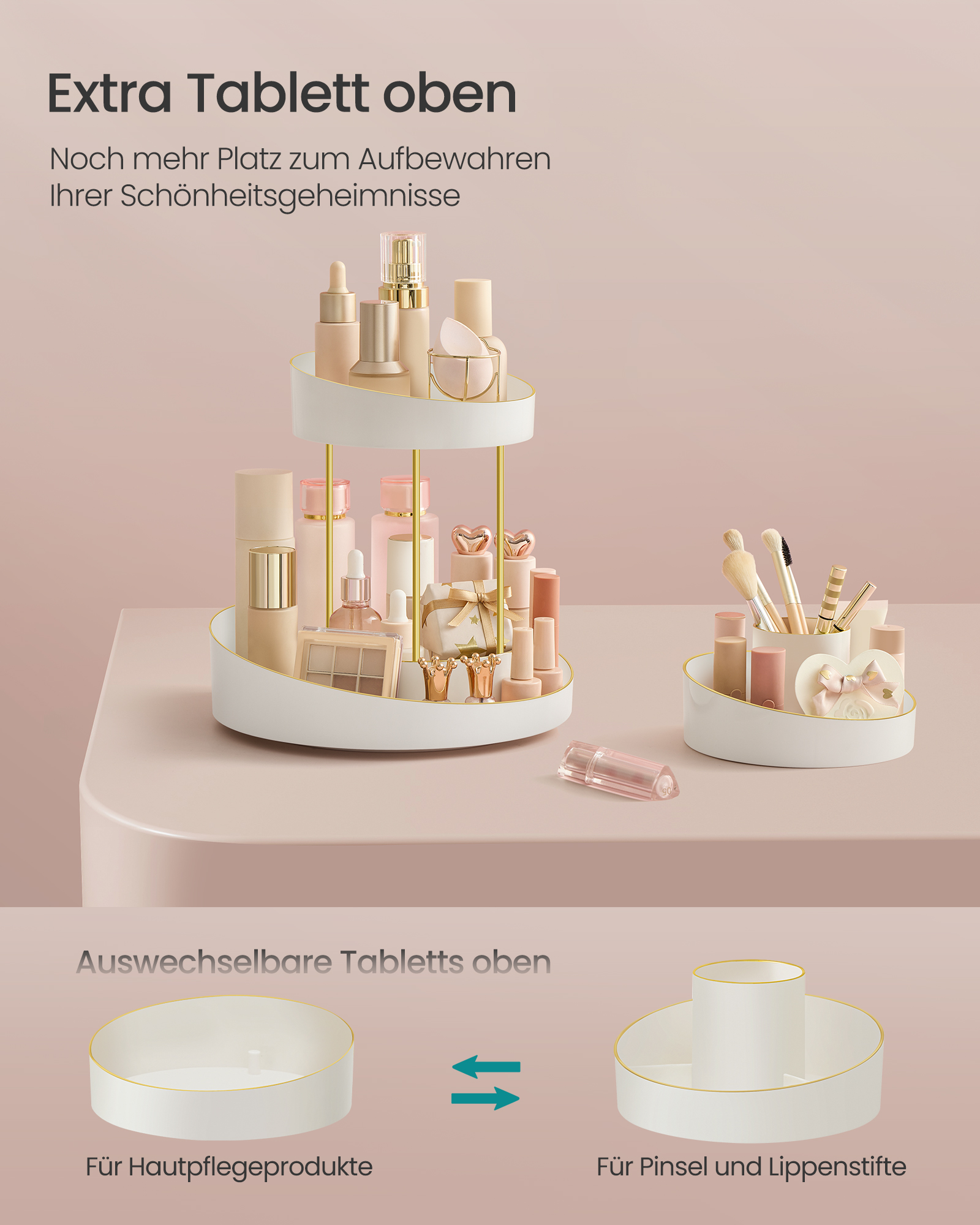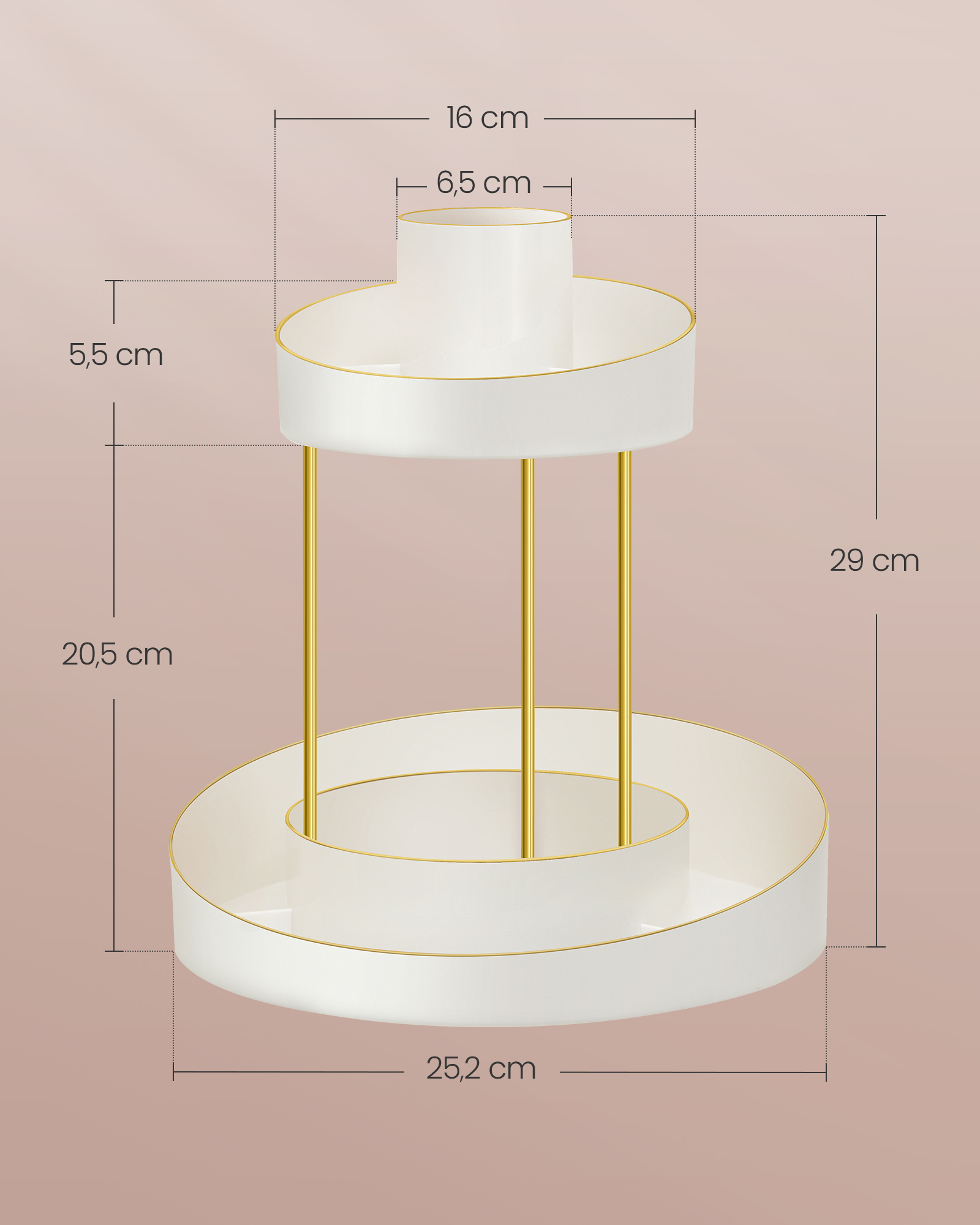 Šis kosmetikos organizatorius yra ne tik praktiškas, bet ir estetiškai patrauklus sprendimas jūsų grožio priemonių laikymui. Jo elegantiškas baltos ir auksinės spalvos derinys suteiks jūsų erdvei rafinuotumo ir stiliaus. Pasirinkite šį organizatorių ir mėgaukitės tvarka bei grožiu kiekvieną dieną!