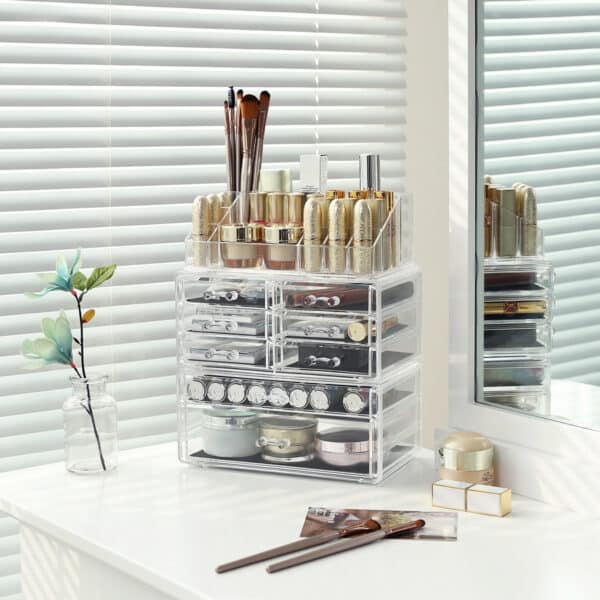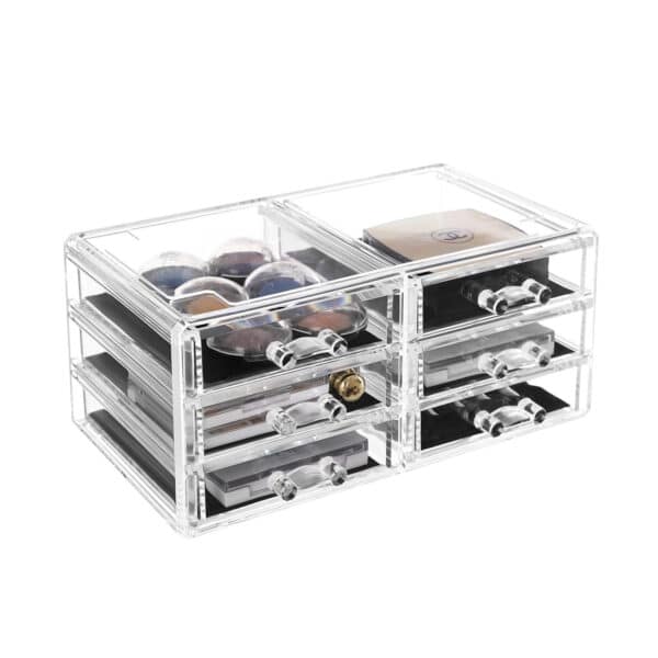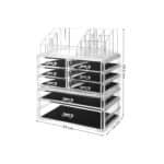 Šis 23,8 x 15,3 x 29,4 cm kosmetikos dėklas pagamintas iš skaidraus PS (polistireno), todėl jis yra ne tik patvaresnis nei akrilas, bet ir suteikia galimybę greitai rasti net ir mažus kosmetikos reikmenis. Dėl skaidraus dizaino jums nereikia atskirai atidaryti visų stalčių, kad galėtumėte ieškoti pinceto.
