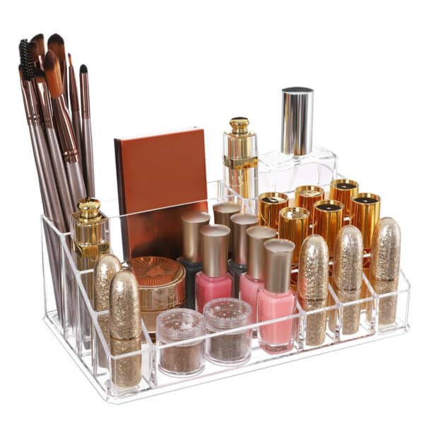 Šviesiai rožiniai lūpų dažai pilnesnėms lūpoms, tamsus tušas tankesnėms blakstienoms, raudonas ryškus veido atspalvis ir akių šešėliai išraiškingoms akims – ko nepadarysi dėl grožio? Tačiau, kad visi jūsų makiažo reikmenys neatsidurtų krūvoje stalčiuje, turime jums paruošę šią kosmetikos tvarkyklę. Čia galite tvarkingai susidėti visą savo makiažą mažuose ir dideliuose stalčiuose bei daugybėje skyrelių viršuje.