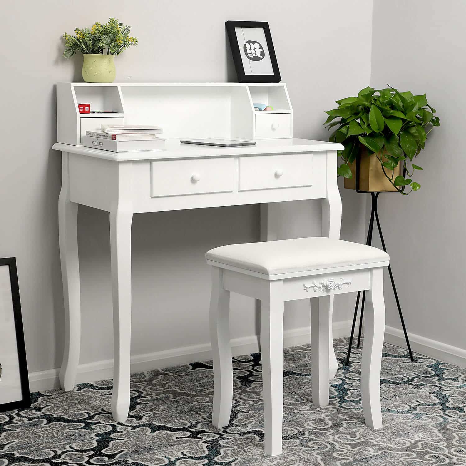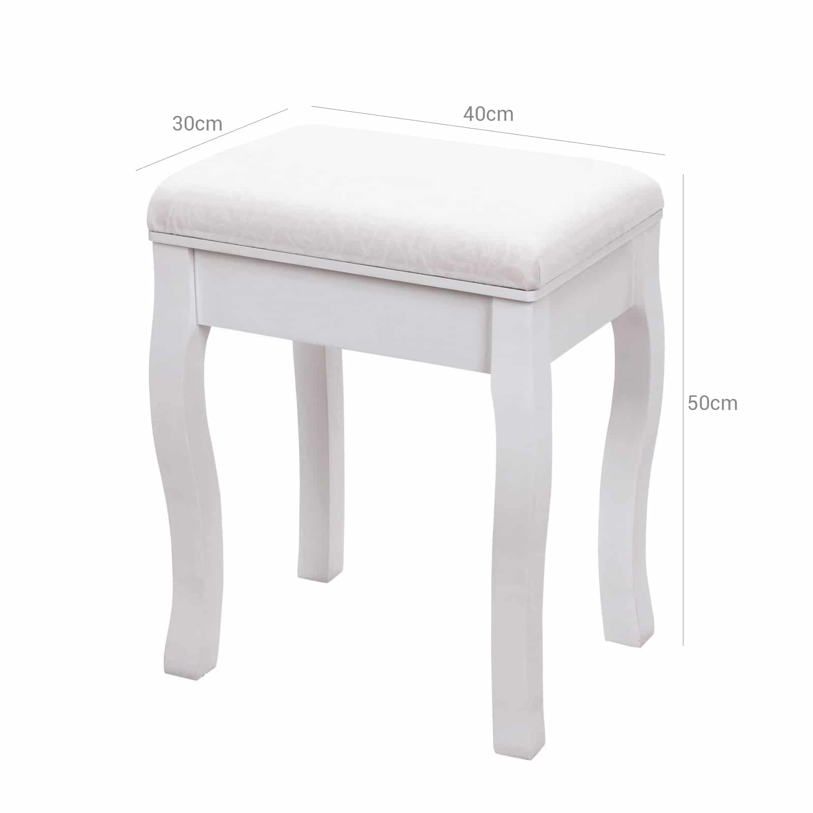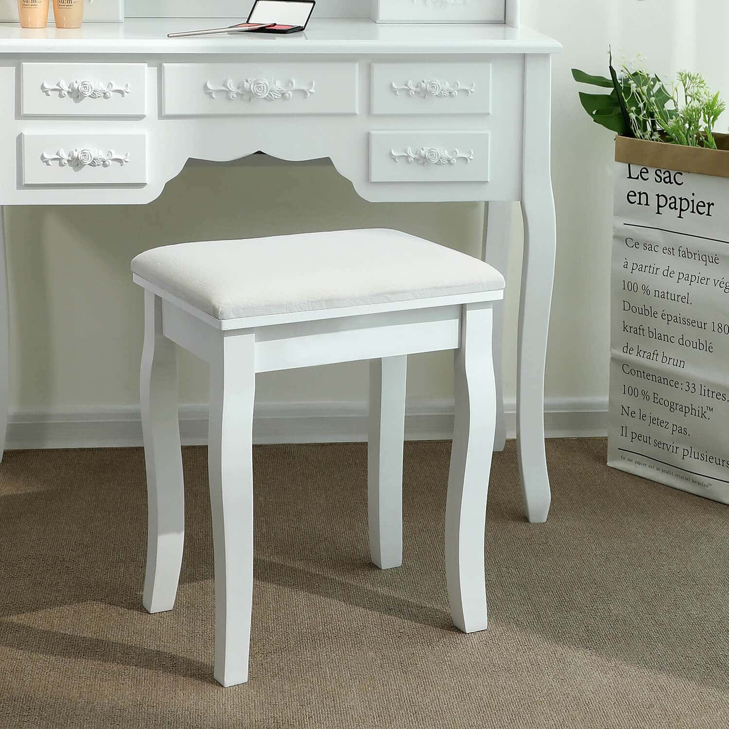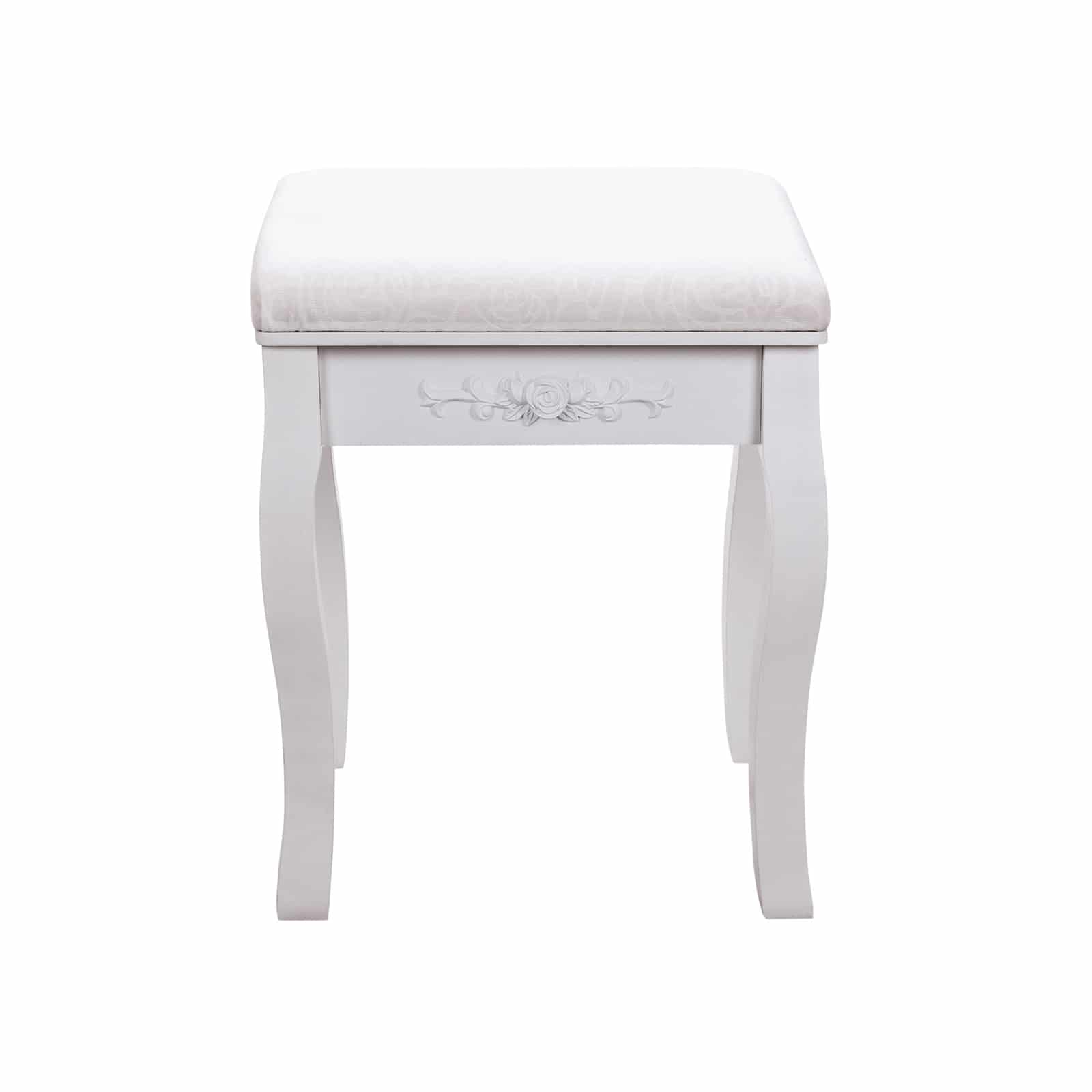 Su pirmos klasės medžio dulkių plokštė (MDF) medžiaga ir storai paminkštinta sėdyne, kosmetinio staliuko taburetė su rožių raštu yra aukštos kokybės. Be elegantiško dizaino, ši makiažo taburetė yra itin praktiška. Balta apdaila suteikia taburetei šiuolaikišką, elegantišką ir aiškią išvaizdą!