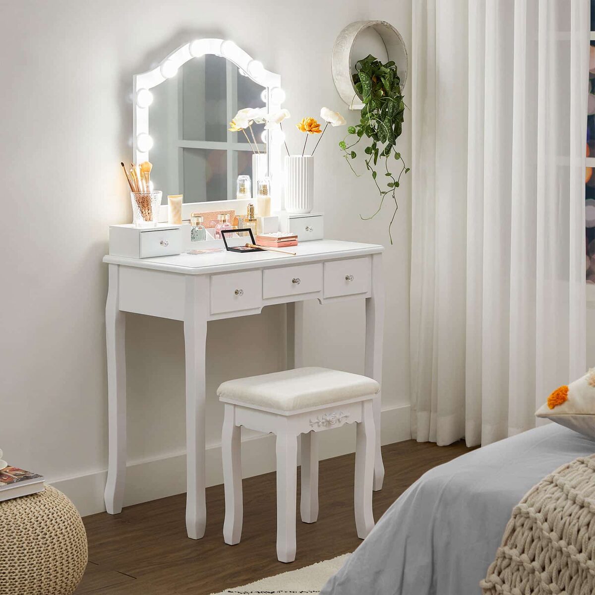 Puiki dovanos idėja gimtadienio, Kalėdų ar kito reikšmingo jubiliejaus proga! Šis svajingas kosmetinis staliukas su dideliu veidrodžiu, daug vietos daiktams ir patogia kėdute privers nusišypsoti kiekvieną!