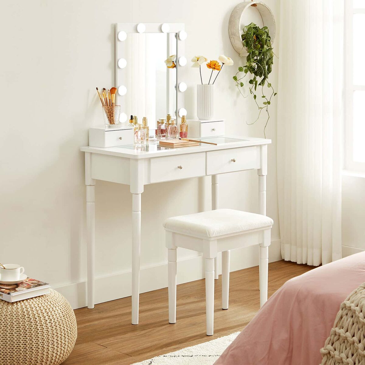 Didelis veidrodis su 10 lempučių užtikrina, kad makiažą atliksite tiksliai. Jūs būsite vakaro žvaigždė arba gražiausia vakarėlio šokėja. Du stalčiai su skaidriais paviršiais leidžia lengvai rasti ir pasirinkti kosmetiką, tad nesunkiai išsirinksite makiažą, atitinkantį dabartinę nuotaiką. Sukurkite savo kosmetikos sodą pagal savo idėjas ir palikite savo namus aukščiausios kokybės!