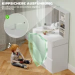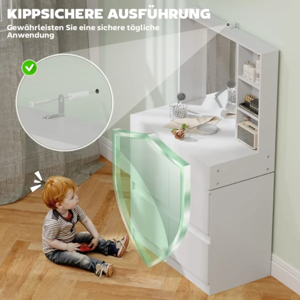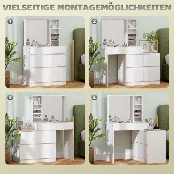Elegantiškas HOMCOM tualetinis staliukas turi platų stalviršį, tris atviras lentynas, keturis stalčius ir dvi spinteles. Tai reiškia, kad visas grožio ir priežiūros priemones rasite po ranka. Didelis veidrodis ant tualetinio staliuko leidžia lengviau pasidaryti makiažą ir pasiruošti, nes matomas aiškus ir išsamus vaizdas. Pasilepinkite kokybišku komfortu ryte.