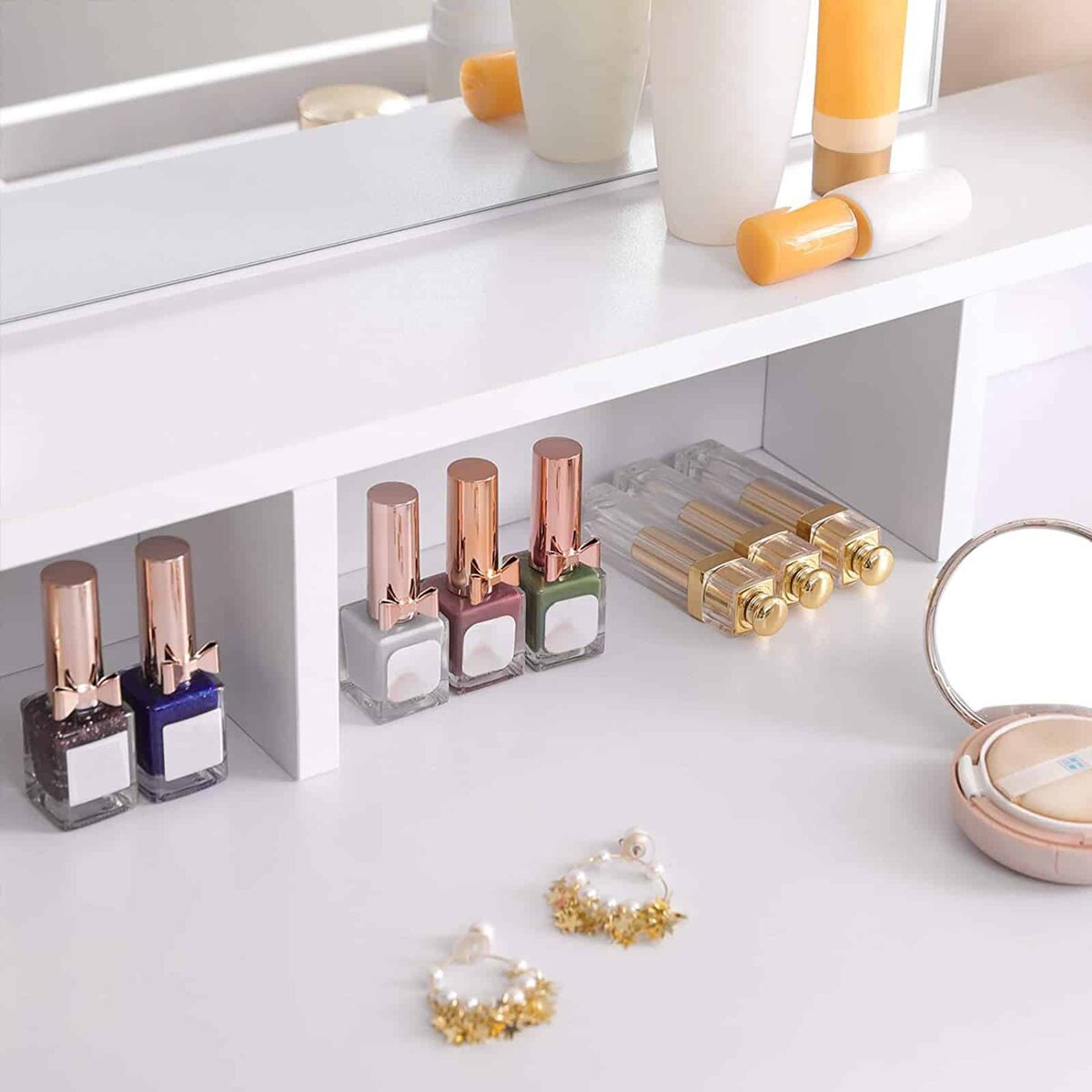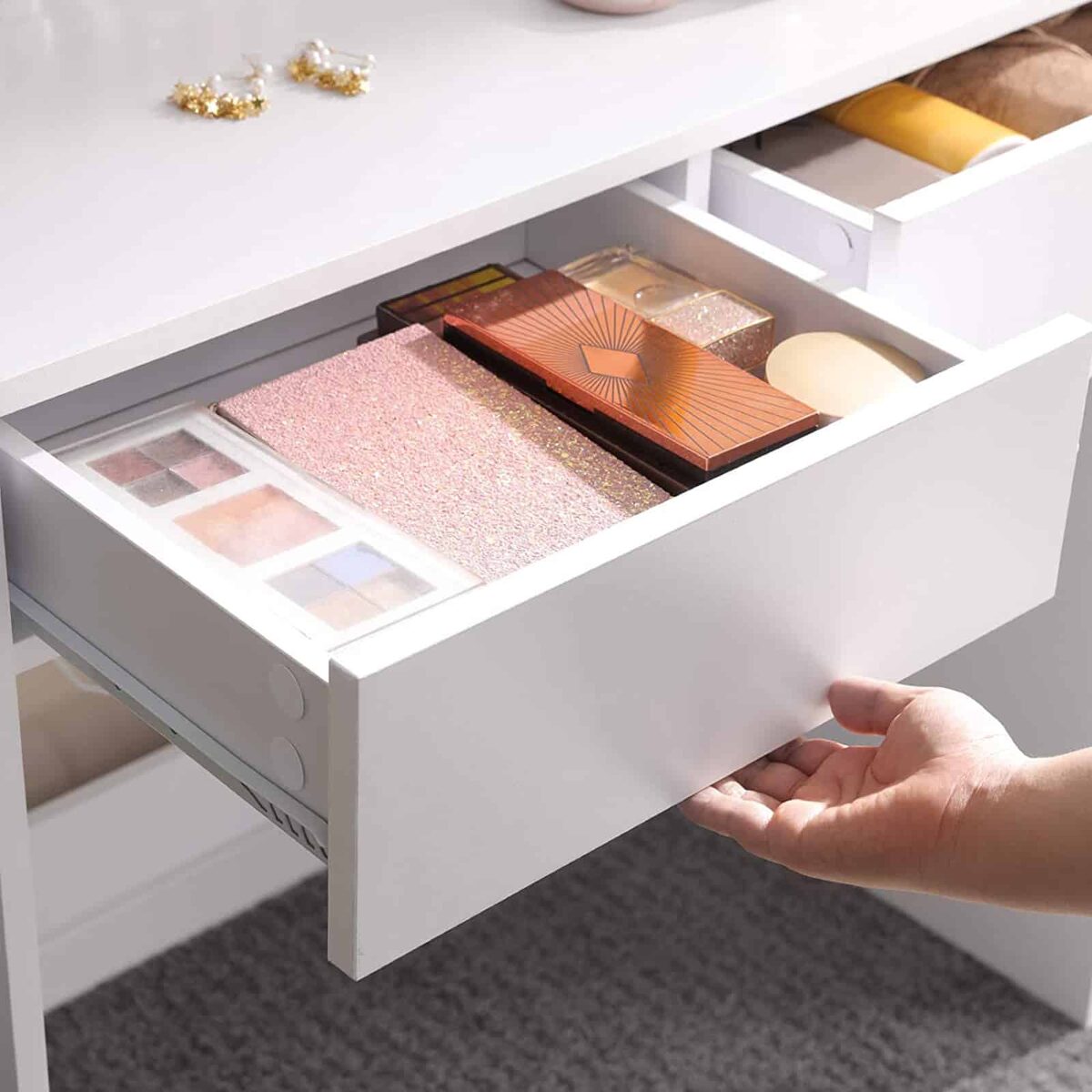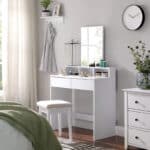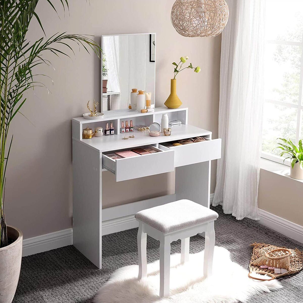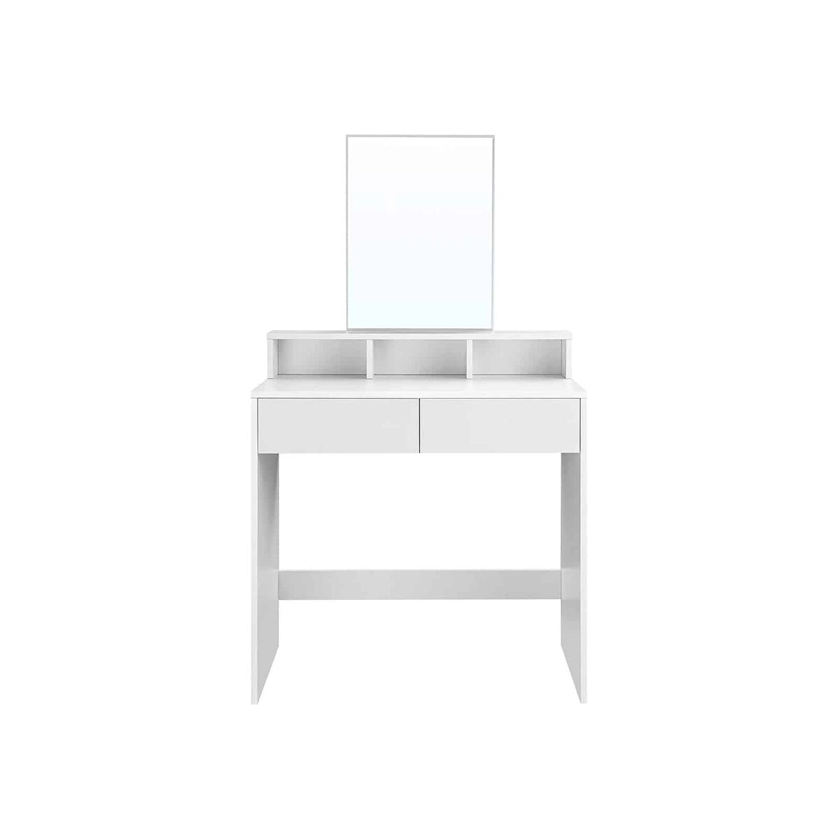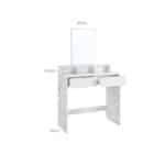 Kosmetinis staliukas su stačiakampiu veidrodžiu yra puikus pasirinkimas jūsų miegamajam ar vonios kambariui. Jo elegantiška balta spalva ir kokybiška medžio drožlių plokštė (MDP) su melamino danga suteikia prabangos ir ilgaamžiškumo.