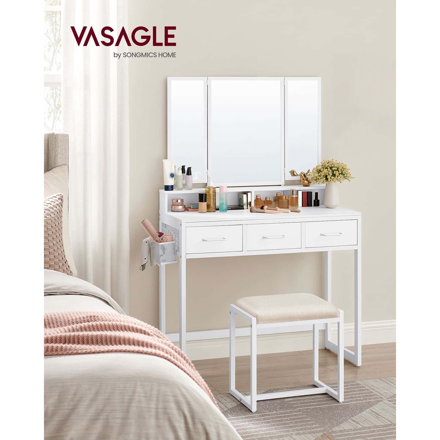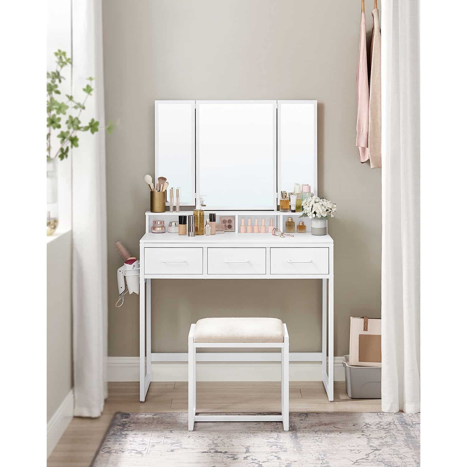 Kosmetinis staliukas su veidrodžiu ir taburete, baltos spalvos, yra puikus pasirinkimas jūsų grožio ritualams. Šis elegantiškas ir funkcionalus baldas suteiks jūsų kambariui prabangos ir stiliaus.