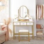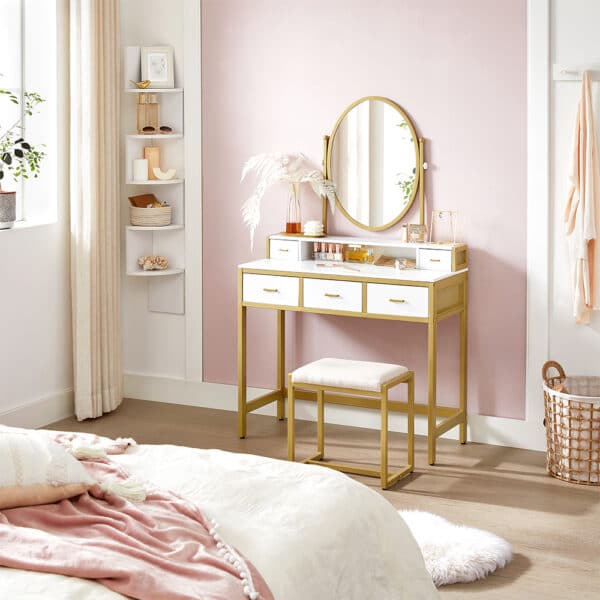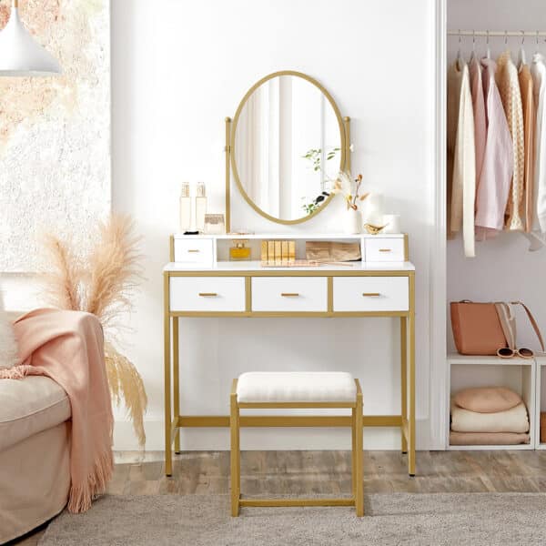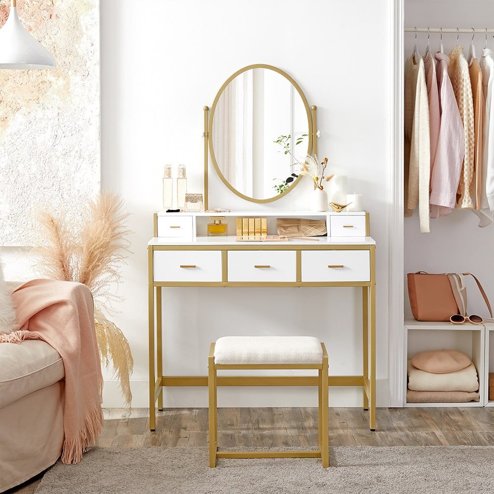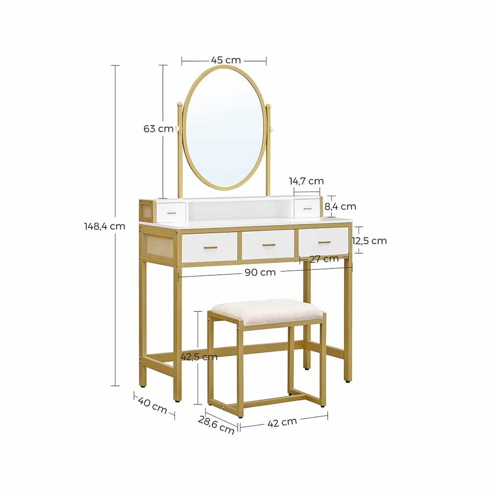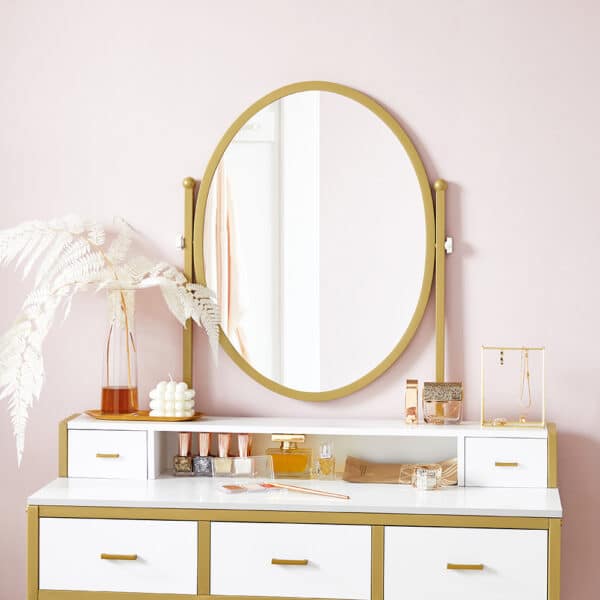 Šis elegantiškas kosmetinis stalo veidrodis, baltas / auksinis, yra puikus pasirinkimas jūsų grožio ritualams. Pagamintas iš aukštos kokybės medžiagų, jis ne tik atrodo prabangiai, bet ir yra itin funkcionalus.