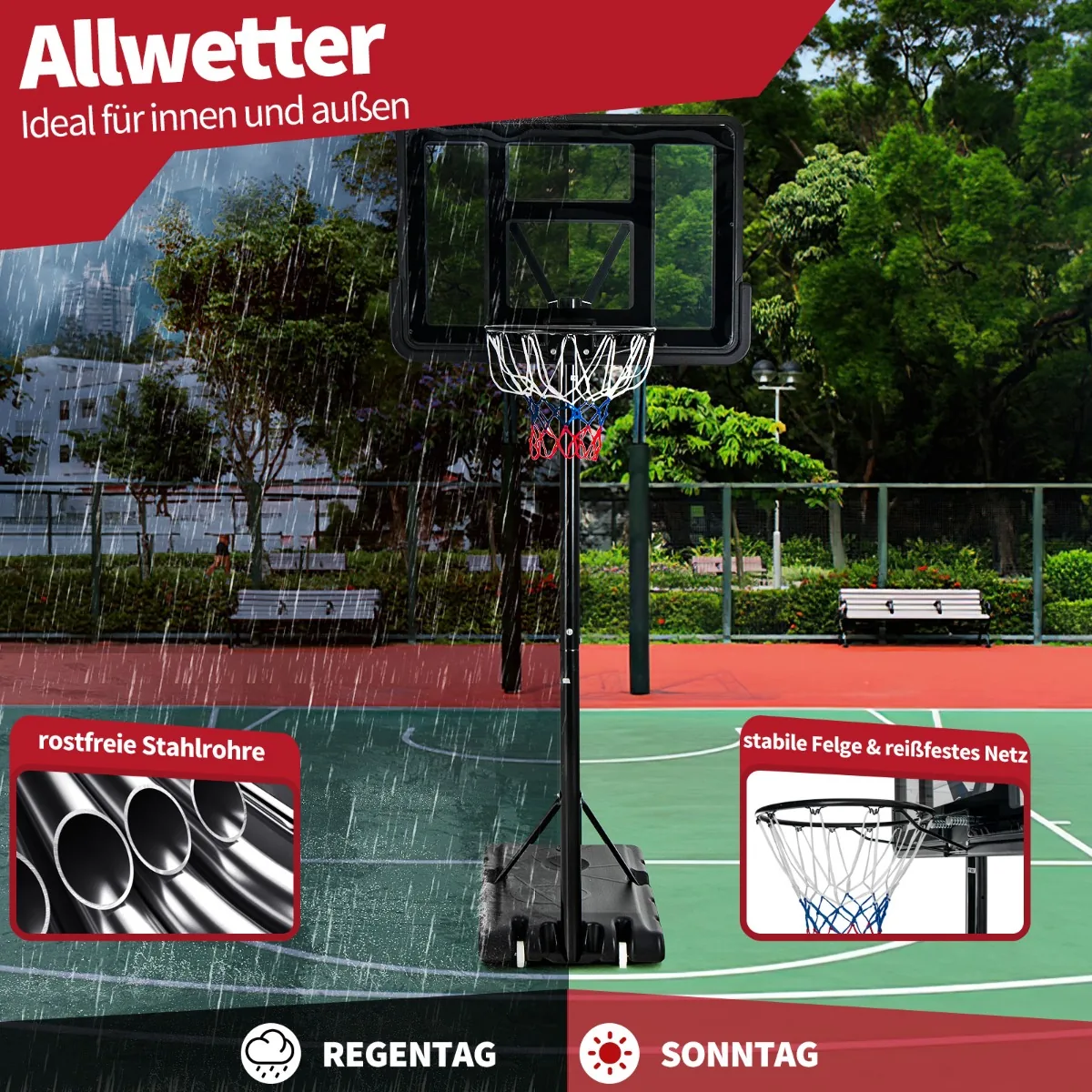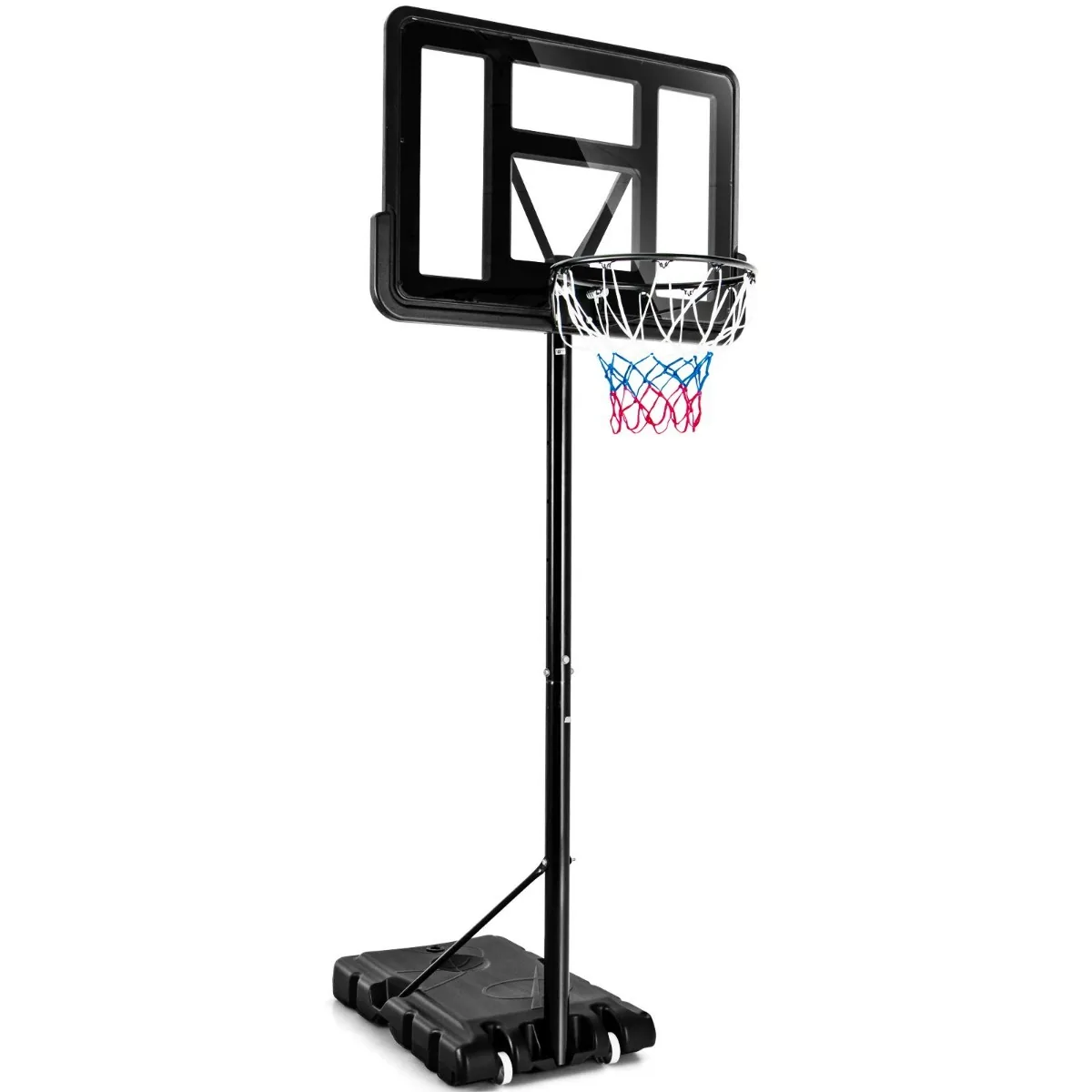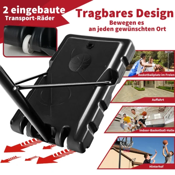 - Nešiojamas krepšinio stovas su reguliuojamu aukščiu nuo 1,3 m iki 3,05 m.