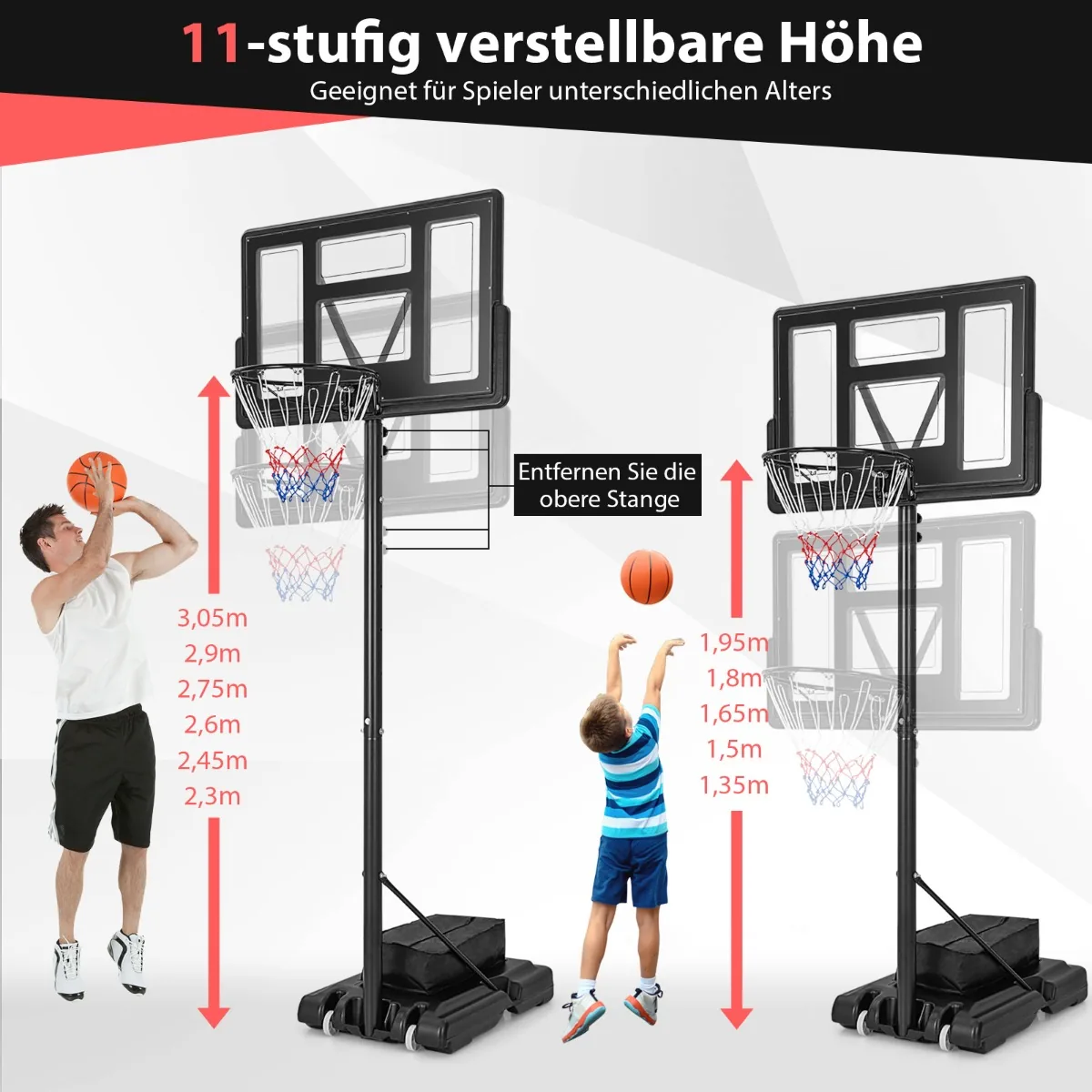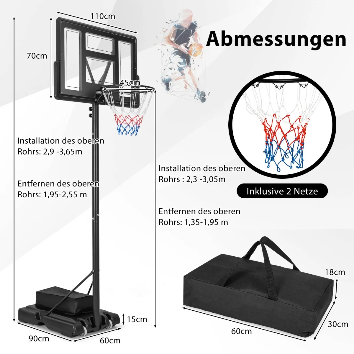 Krepšinio stovas 90x110x365 cm, įvairių spalvų, skirtas tiek vidaus, tiek lauko krepšinio žaidimams. Reguliuojamo aukščio sistema leidžia pritaikyti krepšinio lanką įvairaus amžiaus ir įgūdžių žaidėjams. Užpildomas pagrindas užtikrina stovėjimo stabilumą, o integruoti ratai palengvina krepšinio lanko perkėlimą.