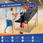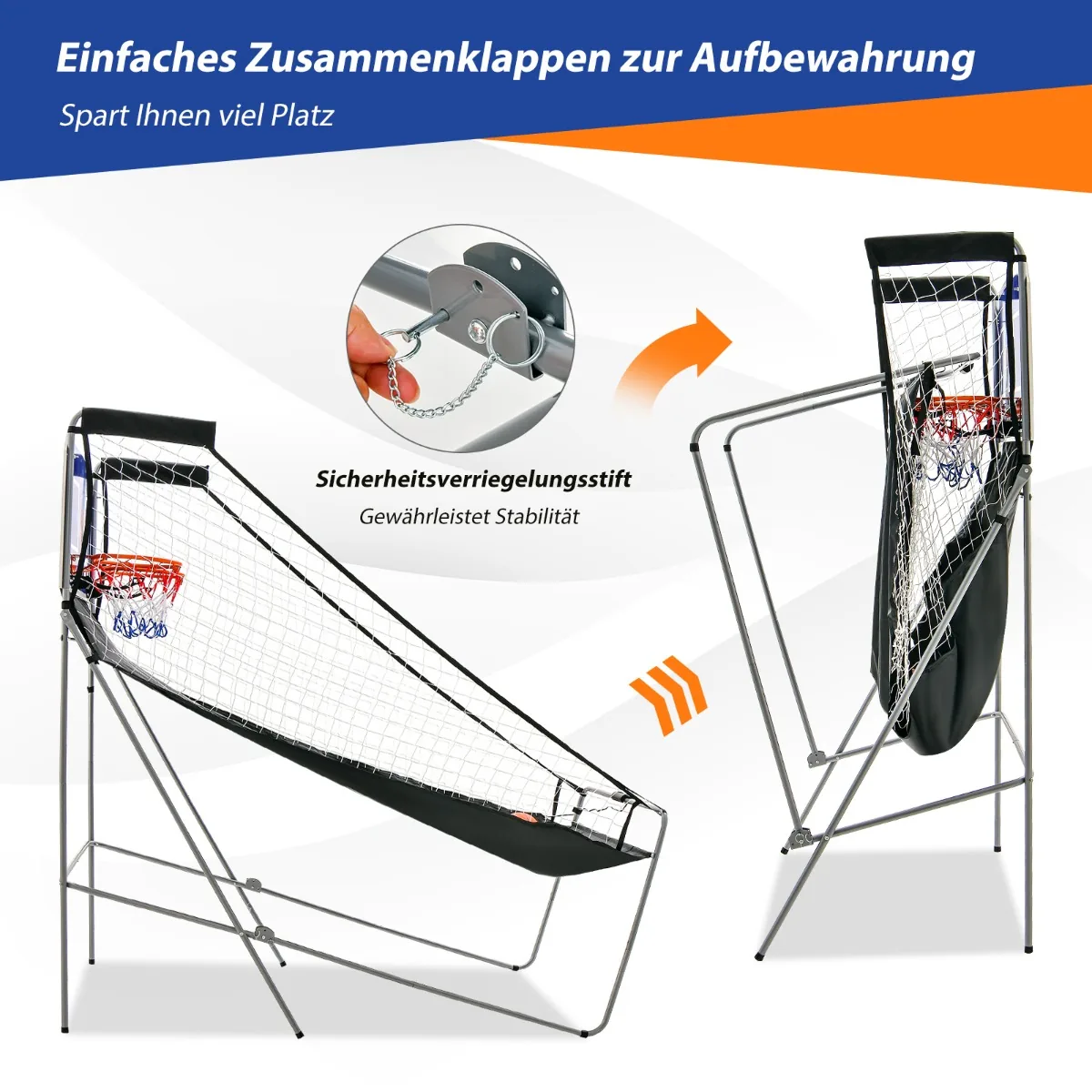Krepšinio žaidimas 216x108x205 cm – puikus sprendimas žaidžia mėgstantiems krepšinį namuose ar lauke. Šis arkadinis aparatas su dviem lankais ir elektronine taškų skaičiavimo sistema suteikia galimybę varžytis 1–4 žaidėjams įvairiuose žaidimo režimuose. Sulankstoma konstrukcija leidžia taupyti vietą, o patvarios medžiagos užtikrina ilgaamžiškumą.