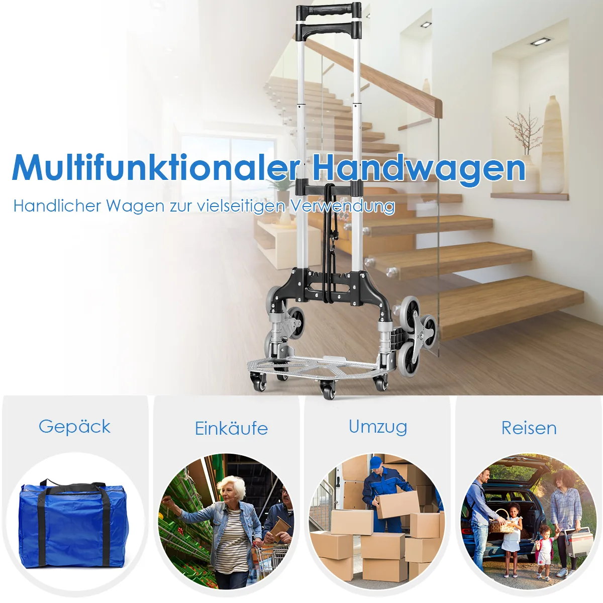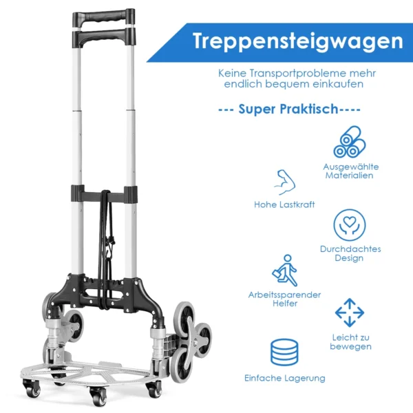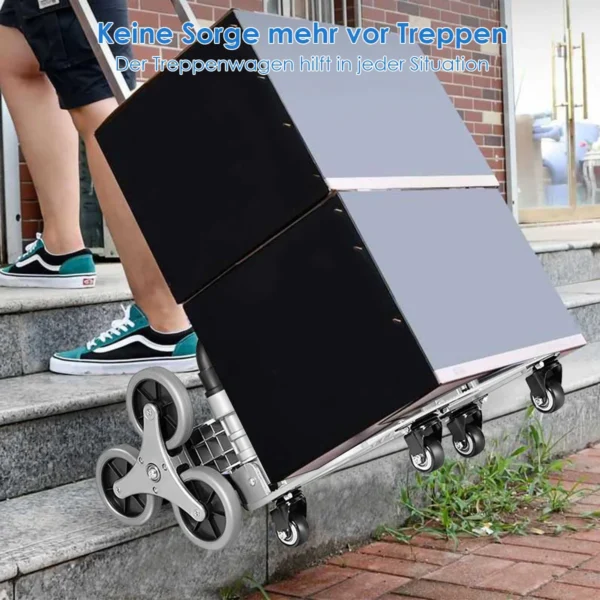 • Laipiojimo laiptais vežimėlis su trijų ratų konstrukcija ir keturiais universalais ratukais.