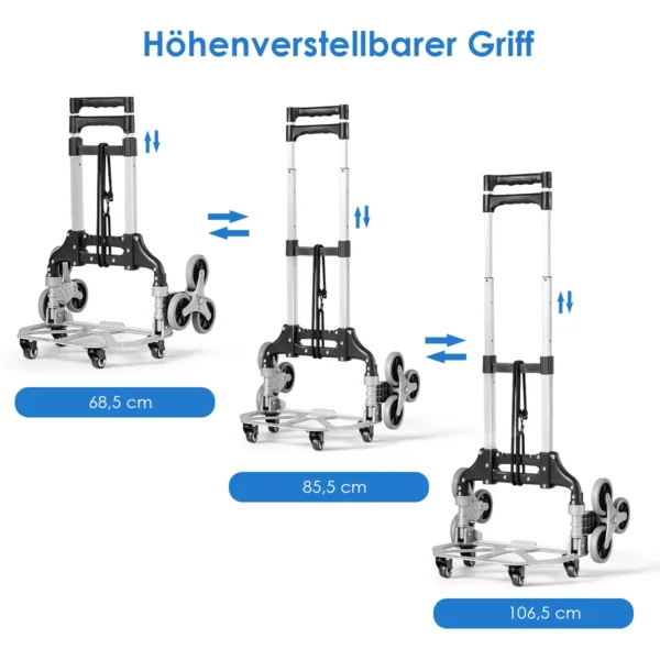Krovinių vežimėlis 39x27x106,5 cm sidabrinės ir juodos spalvos skirtas patogiam sunkių pirkinių krepšių, lagaminų ir kitų krovinių transportavimui laiptų erdvėse. Trijų ratų konstrukcija su papildomais universalais ratukais užtikrina stabilumą ir lengvą judėjimą. Reguliuojama teleskopinė rankena ir elastinis dirželis didina saugumą pervežant įvairaus dydžio krovinius.