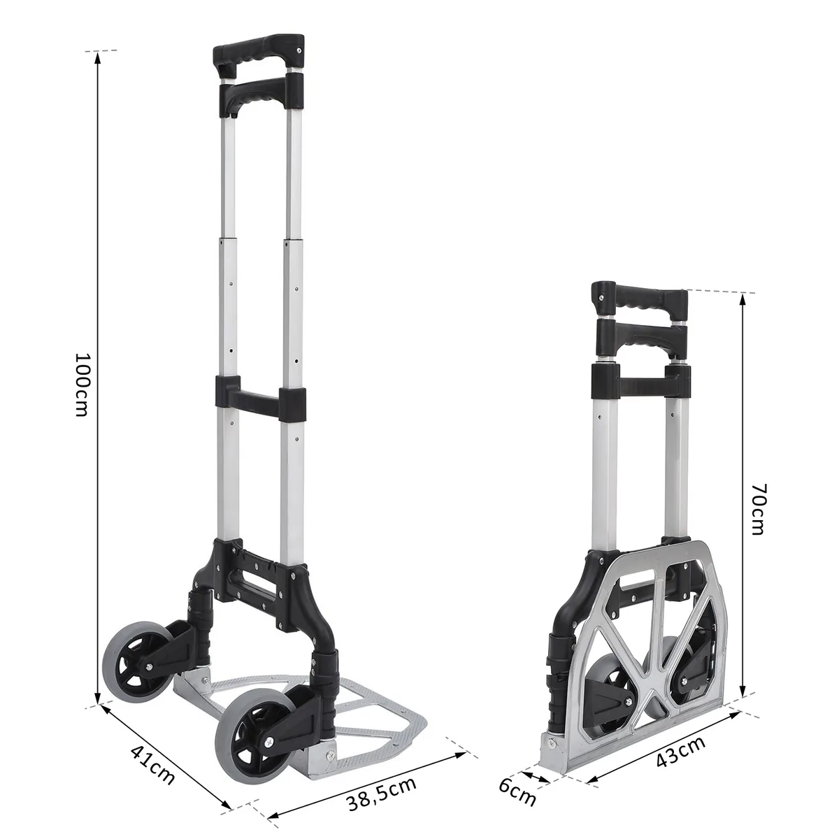 Mūsų krepšelis iš HOMCOM palengvina jūsų bagažo, paketų, gėrimų dėžių ir kitų didelių gabaritų gabenimą. Jo tvirta aliuminio konstrukcija gali pakrauti apie 70 kg prekių. Jis ne tik sulankstomas, bet ir lengvai laikomas, nes sveria tik 3 kg. Jis susilanksto, kad sutaupytų vietos, todėl lengvai nešiotis rankoje arba automobilio bagažinėje. Dėl 3 pakopų reguliuojamo aukščio rankenos (100cm, 90cm ir 60cm) tinka įvairių išmatavimų kraunamos prekės.