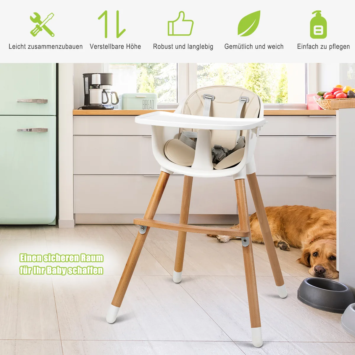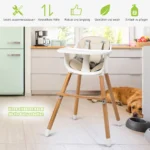 Kūdikio maitinimo kėdutė 57x57x83cm, šviesiai rudos ir kreminės spalvos, skirta užtikrinti komfortą ir saugumą vaikams nuo 6 iki 36 mėnesių. Kėdutė pagaminta iš natūralios buko medienos bei aplinkai nekenksmingų medžiagų, turi reguliuojamą stalviršį, atramą kojoms ir keičiamą aukštį, todėl puikiai prisitaiko prie vaiko poreikių.