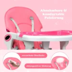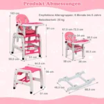 Kūdikio maitinimo kėdutė 58,5x51x103cm, baltos ir rožinės spalvos, skirta užtikrinti patogų ir saugų maitinimo procesą. Konvertuojama kėdutė prisitaiko prie vaikų augimo, siūlydama įvairias funkcijas ir reguliavimo galimybes. Lengvai transformuojama į stalą, supamą kėdutę ar aukštą kėdutę.