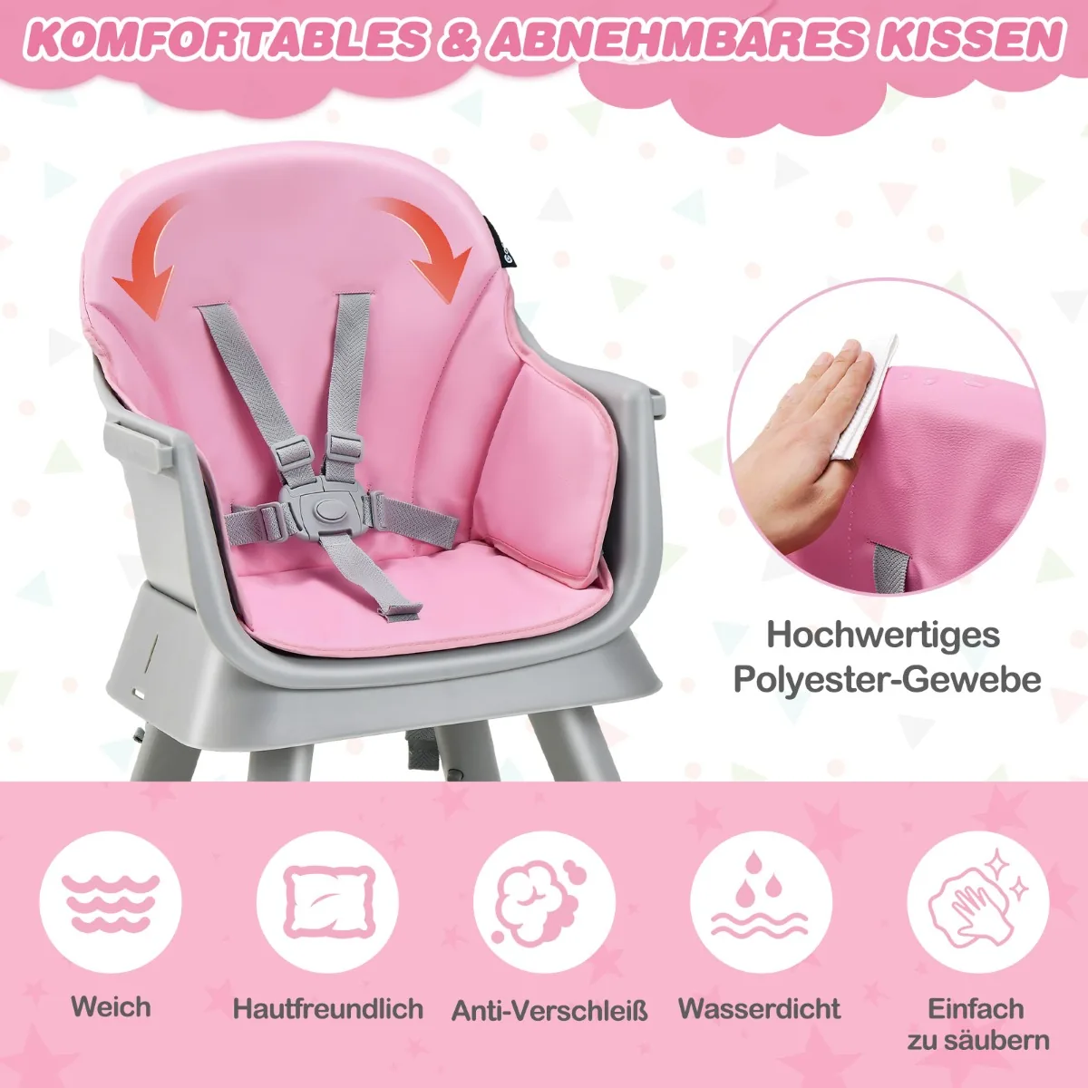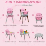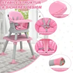 Kūdikio maitinimo kėdutė 58x58x98 cm rožinės ir pilkos spalvos – funkcionali ir daugiafunkcė kėdutė, skirta vaikams nuo 6 iki 36 mėnesių. Ši aukšta kėdutė prisitaiko prie įvairių vaiko augimo etapų ir padeda ugdyti savarankiškumą maitinantis bei žaidžiant.