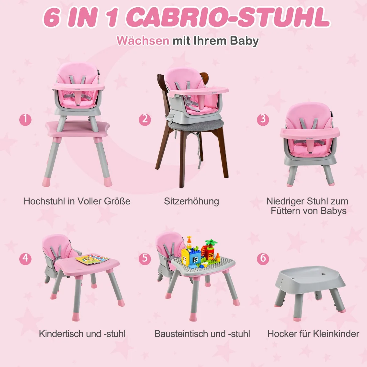 - Daugiafunkcė 6 viename kėdutė – aukšta kėdutė, automobilinė kėdutė, žema kėdutė, mokymosi stalas su kėdute, statybinis stalas ir taburetė kūdikiui.