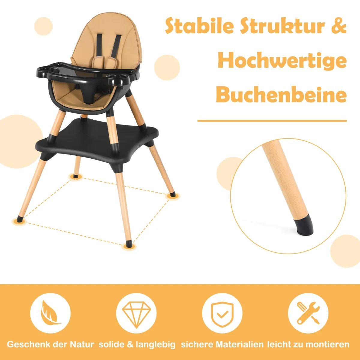- Aukšta kūdikio maitinimo kėdutė su nuimamu ir reguliuojamu padėklu (4 aukščiai).