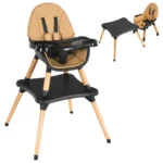 Kūdikio maitinimo kėdutė rudos ir juodos spalvos, matmenų 62x62x100 cm, skirta užtikrinti patogumą ir saugumą valgant, žaidžiant ar mokantis. 4 viename dizainas pritaikytas įvairaus amžiaus vaikams ir lengvai transformuojamas pagal augančius poreikius.