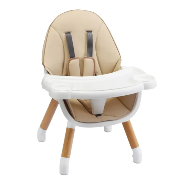 Kūdikio maitinimo kėdutė 62x62x100cm, šviesiai rudos ir baltos spalvų derinyje, skirta užtikrinti komfortą ir saugumą maitinimo metu. Dėl daugiafunkcinio „4-in-1“ dizaino ši kėdutė pritaikoma skirtingo amžiaus vaikams, suteikiant praktišką sprendimą augančioms mažylių poreikiams.