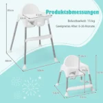 Kūdikio maitinimo kėdutė 66x60x85cm, baltos ir sidabrinės spalvos, puikiai tinka vaikų maitinimui, žaidimams ir įvairioms užduotims. Ši daugiafunkcė aukšta kėdutė yra lengvai reguliuojama ir prisitaiko prie augančio vaiko poreikių.