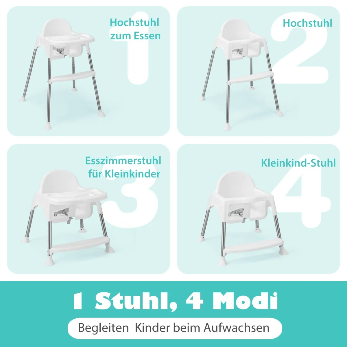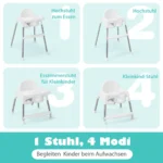 - 4 viename aukšta kėdutė, kurią galima naudoti kaip kūdikio kėdutę ant grindų, aukštą kėdę ar valgomojo kėdę.