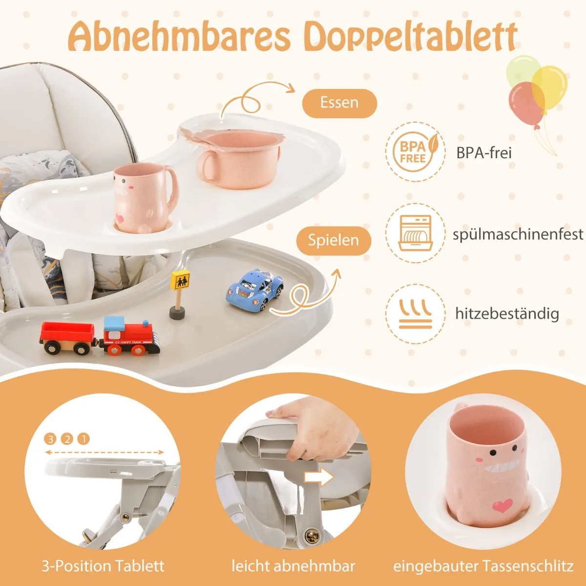 - Nuimamas dvigubas padėklas su 3 padėčių reguliavimu, tinkamas maistui ir žaidimams, atsparus karščiui ir plaunamas indaplovėje.