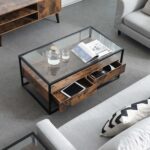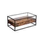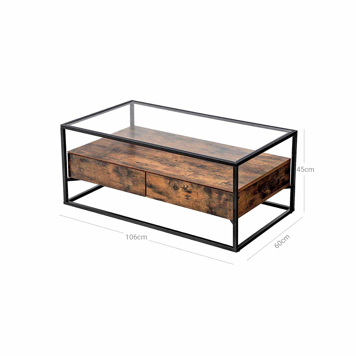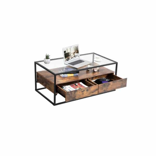 Elegantiškas pramoninio dizaino kvadratinis kavos staliukas su stiklu, ruda/juoda, pasižymi tvirtu stiklo paviršiumi, stabiliu geležiniu rėmu ir vintažinio stiliaus lentyna. Šis staliukas atrodo labai elegantiškai, beveik tarsi iš muziejaus. Ant viršaus galite uždėti didelę vazą su šviežiomis gėlėmis. Nuotolinio valdymo pultas ir žurnalai visada bus aiškiai matomi ir pasiekiami po stiklo plokšte. Du erdvūs stalčiai suteikia dar daugiau vietos daiktams laikyti.