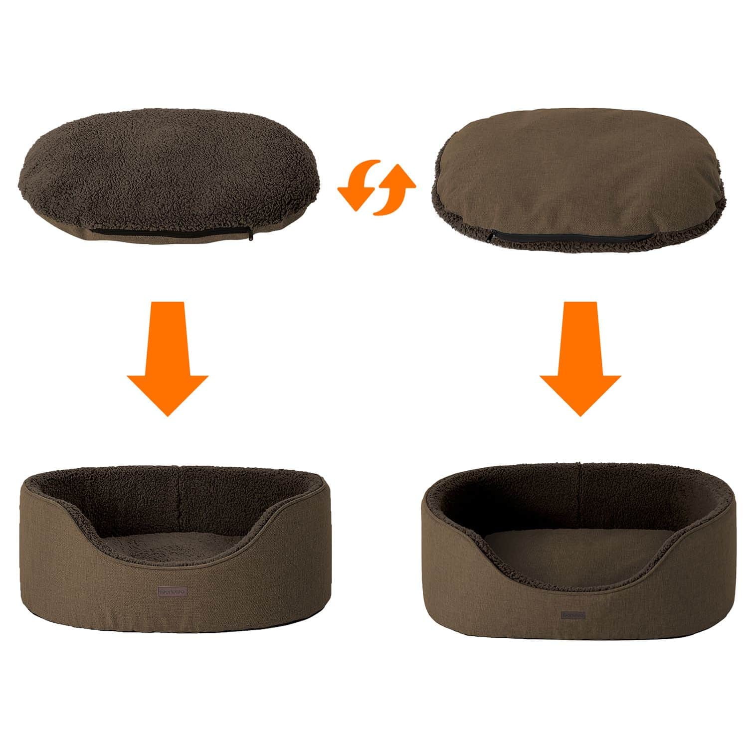 Pasukite vieną kartą, prašome! Šunų guolyje yra keletas skanėstų: pagalvėlę galima nuimti ir pasukti, kad šuo galėtų prisiglausti prie patalynės imitacijos arba pliušinio audinio. Mielos pagalvės užvalkalas taip pat yra nuimamas, kad galėtumėte lengvai jį išvalyti mašinoje.
