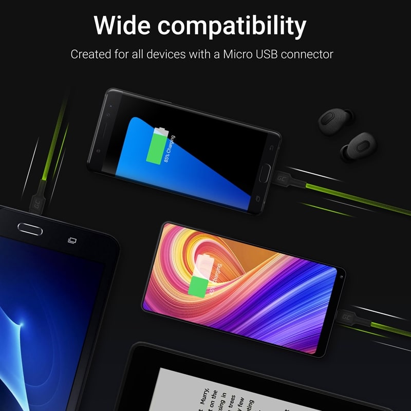 laidas Green Cell Ray USB-A – microUSB geltonas LED 120cm su Ultra Charge QC3.0 greito įkrovimo palaikymu