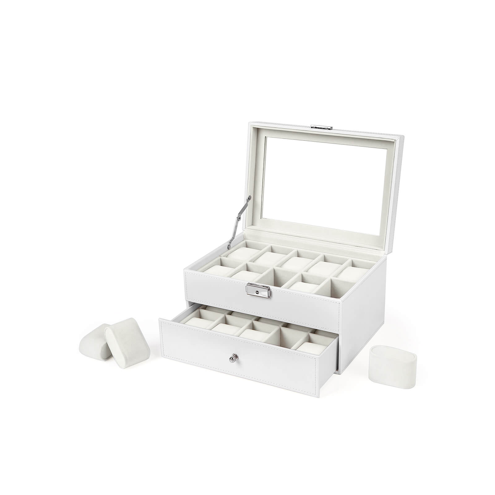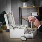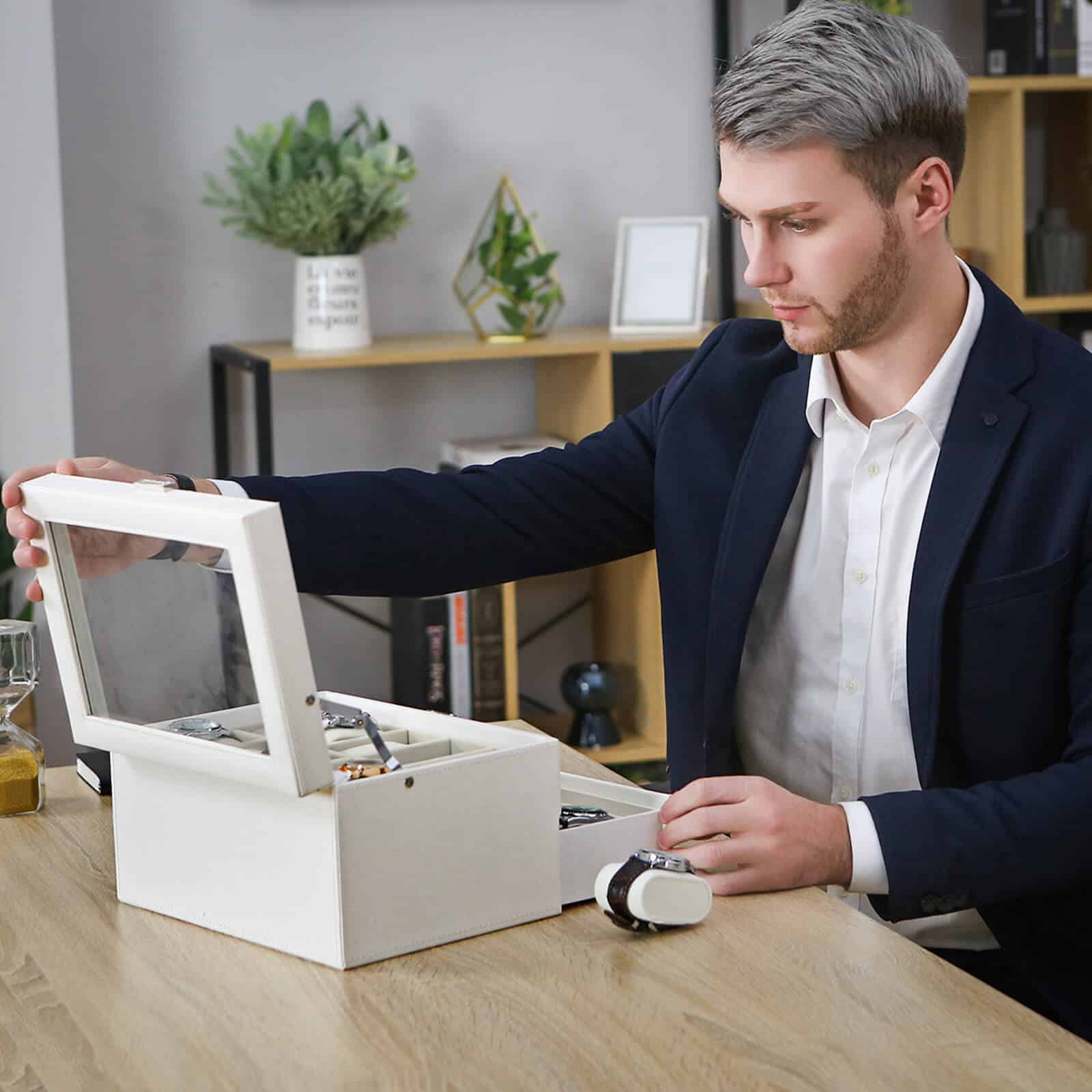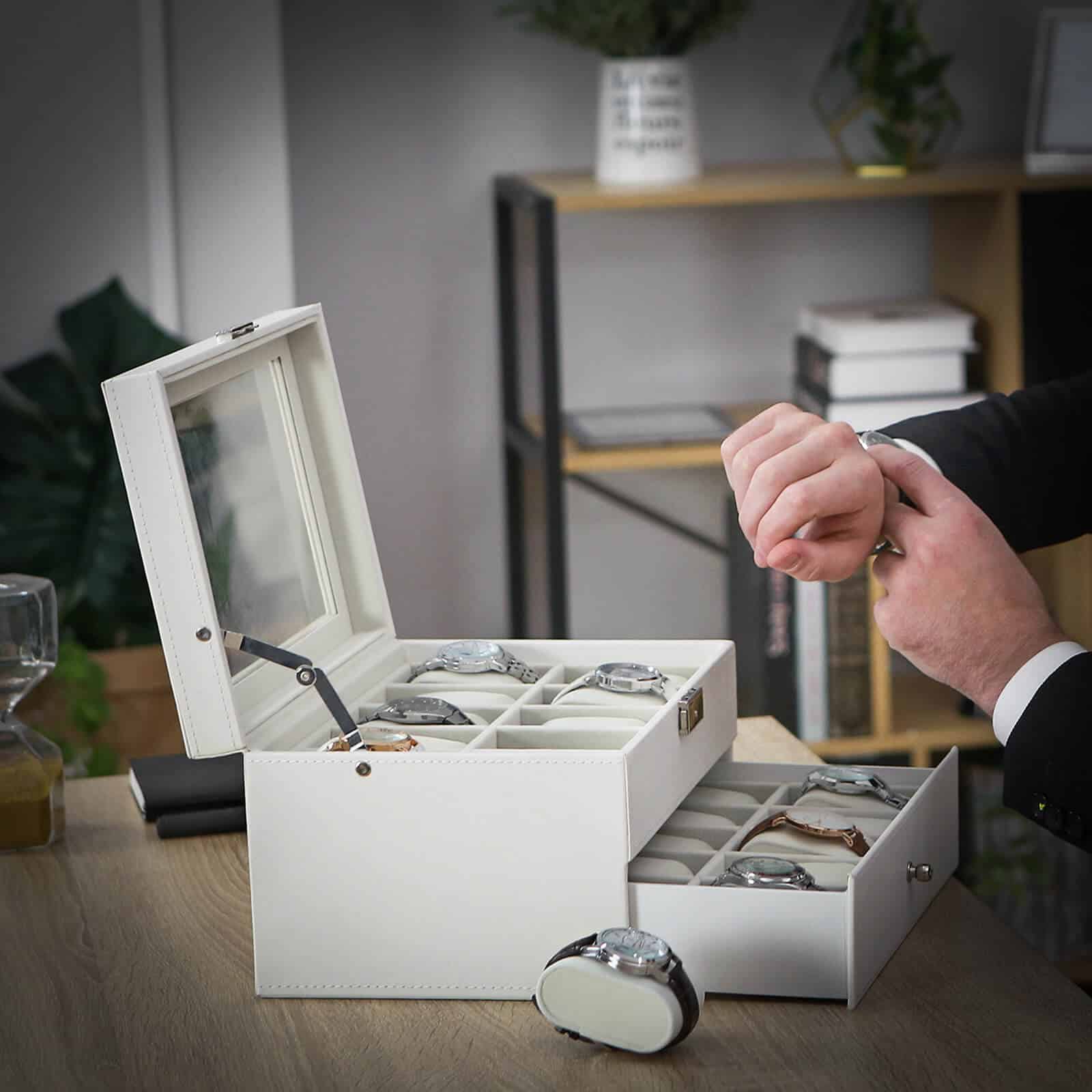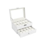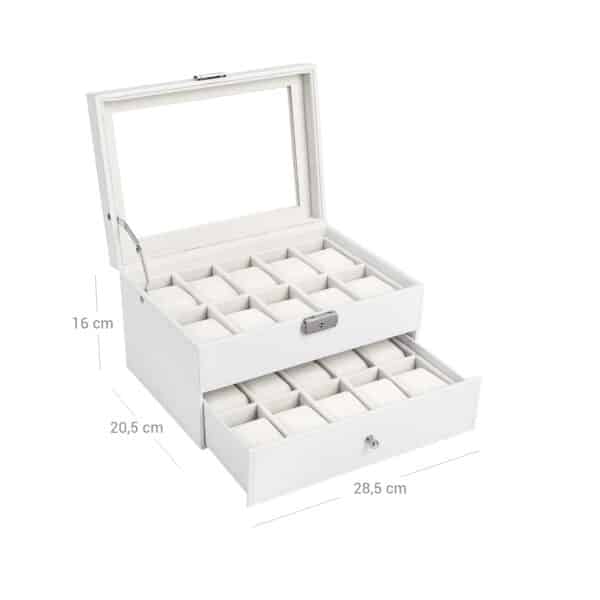Laikrodžių dėžutė – kilni apsauga jūsų laikrodžių kolekcijai, tikra akį traukianti kiekvienuose šiuolaikiniuose namuose! Laikrodžio dėžutė su tikru stikliniu langu – stilingas ir praktiškas būdas laikyti laikrodžius. Gerą šios laikrodžio dėžutės kokybę atspindi naudojamos medžiagos, puikus dizainas, taip pat tikslus ir kruopštus meistriškumas. Ji ne tik gerai atrodo, bet ir apsaugo jūsų vertingus mėgstamus daiktus nuo dulkių ir įbrėžimų. Puikiai pagaminta ir lengvai valoma, ši elegantiška Songmics laikymo dėžutė yra būtina visiems laikrodžių mylėtojams.