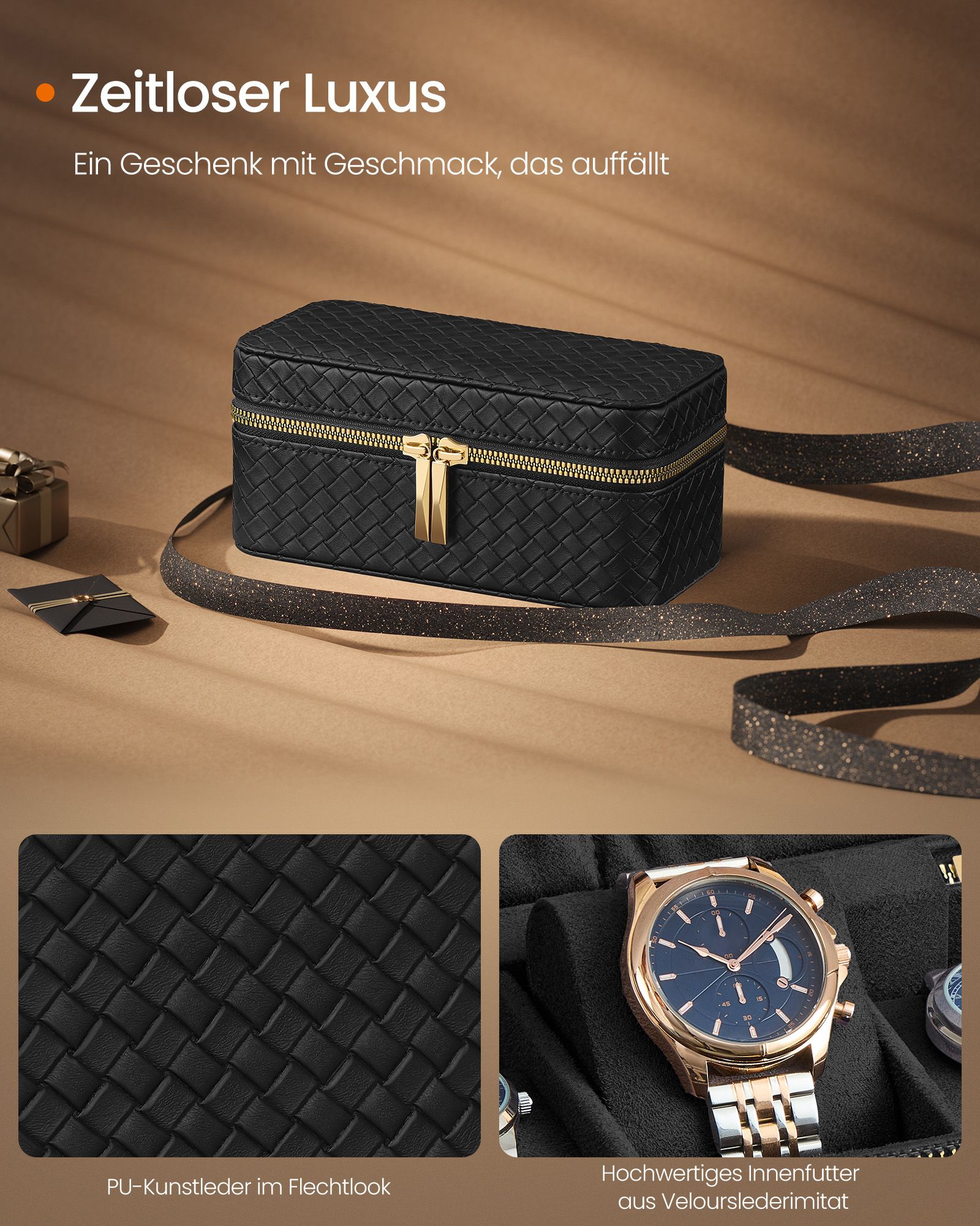 Ši elegantiška laikrodžių dėžutė yra puikus sprendimas jūsų laikrodžių kolekcijos saugojimui. Juodos ir auksinės spalvos derinys suteikia prabangos ir stiliaus jūsų interjerui.