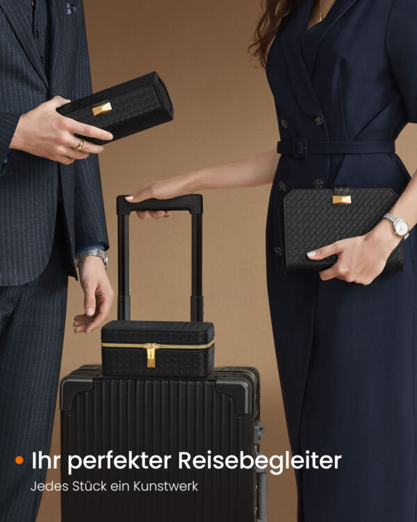Pagaminta iš aukštos kokybės PU (poliuretano), zomšos imitacijos ir metalo, ši dėžutė yra tvirta ir ilgaamžė. Jos dydis yra 10 x 20 x 9 cm (D x P x A), o svoris siekia 390 g.