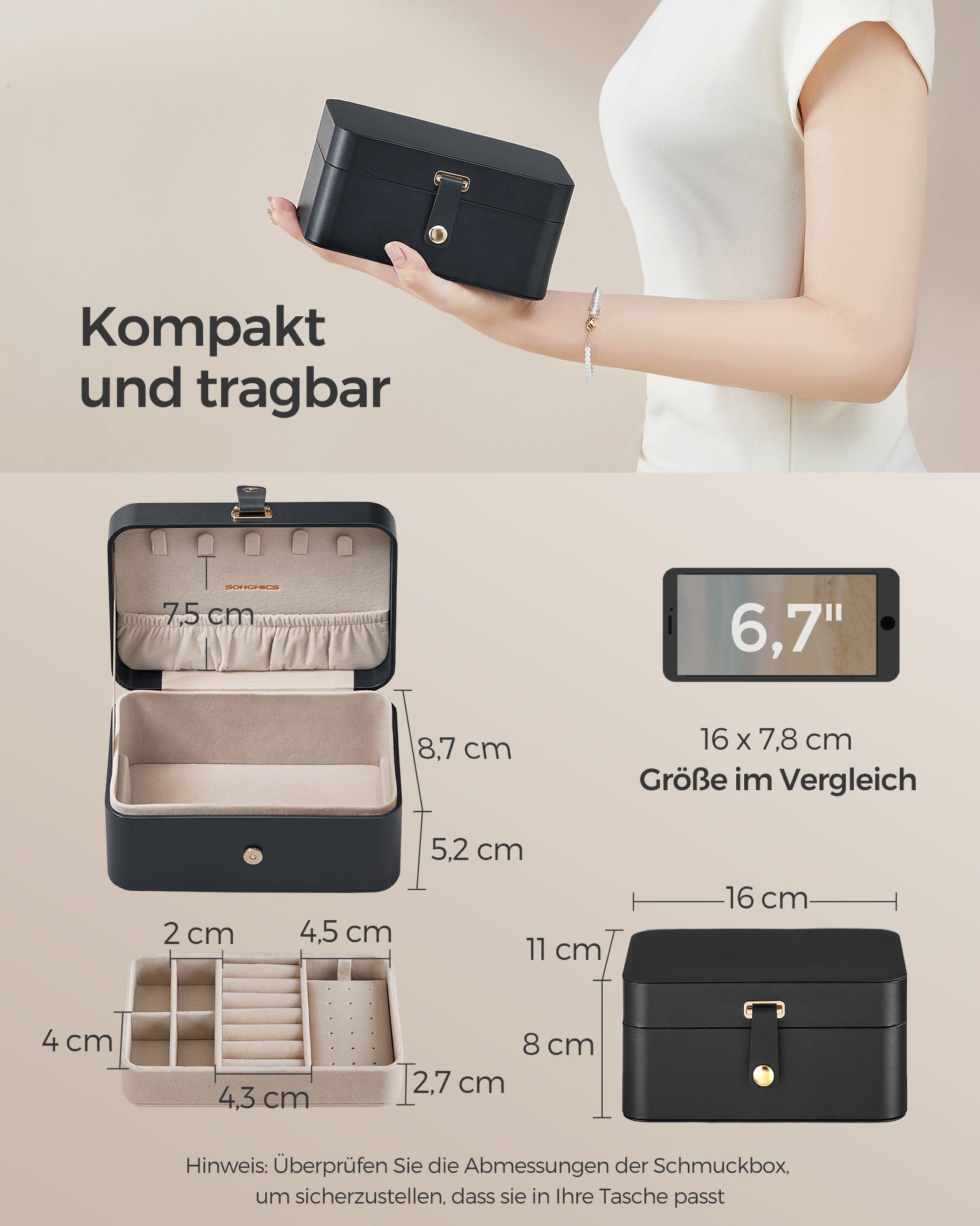 Pagaminta iš aukštos kokybės plastiko, popieriaus su PU danga ir aksomo, ši dėžutė yra patvari ir ilgaamžė. Jos matmenys yra 11 x 16 x 8 cm (D x P x A), o svoris siekia 0,3 kg.