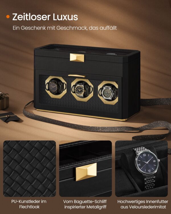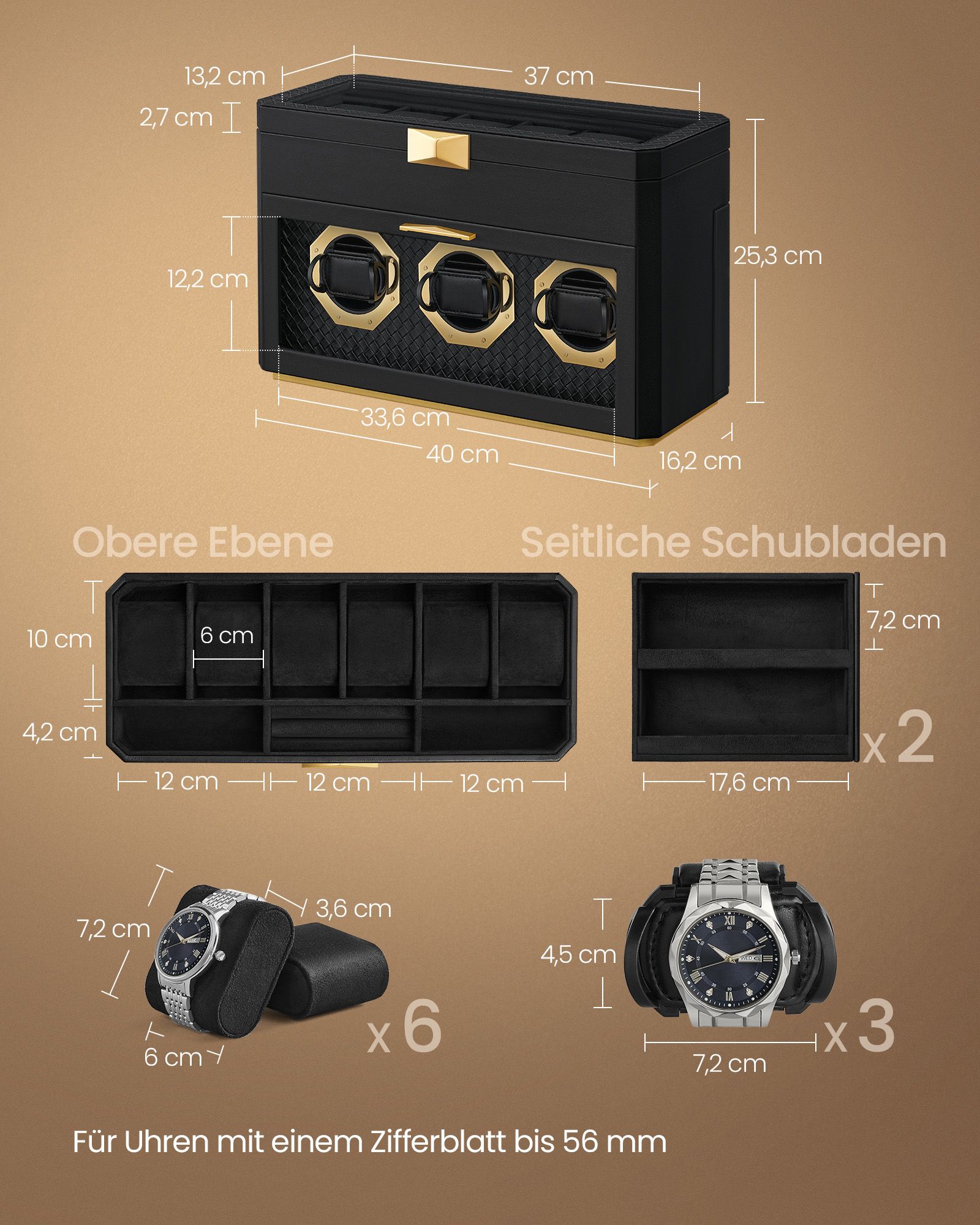Ši elegantiška laikrodžių dėžutė, kurios matmenys yra 16,2 x 40 x 25,3 cm, yra puikus pasirinkimas jūsų laikrodžių kolekcijai. Juodos ir auksinės spalvos derinys suteikia prabangos ir stiliaus jūsų interjerui.