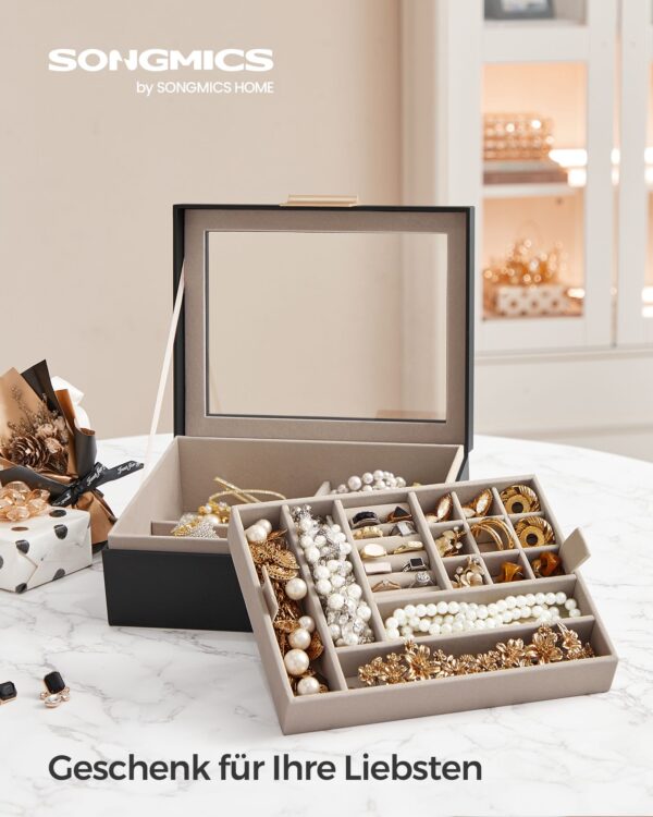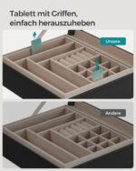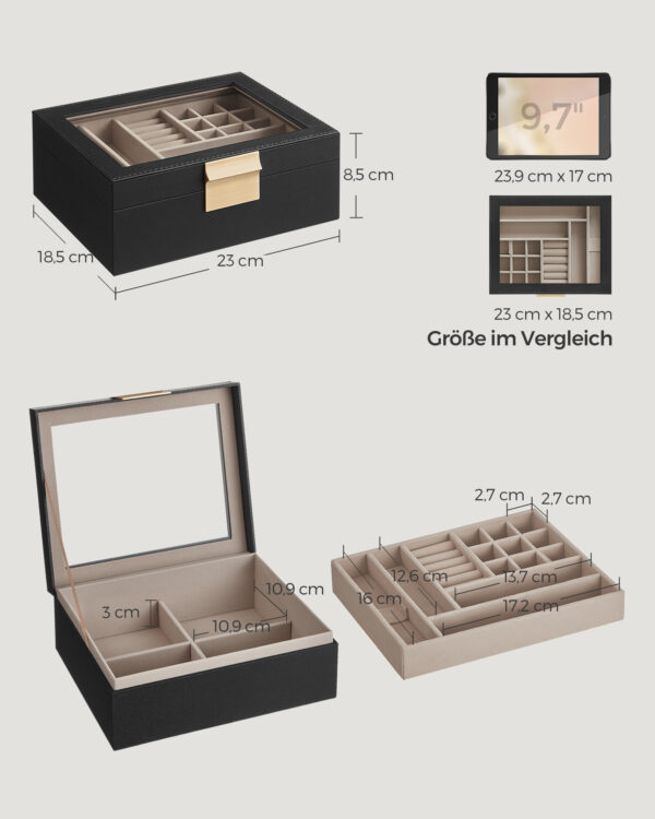 Ši elegantiška laikrodžių dėžutė yra puikus sprendimas jūsų laikrodžių ir aksesuarų laikymui. Juodos ir smėlio spalvos derinys suteikia prabangos ir stiliaus jūsų interjerui.