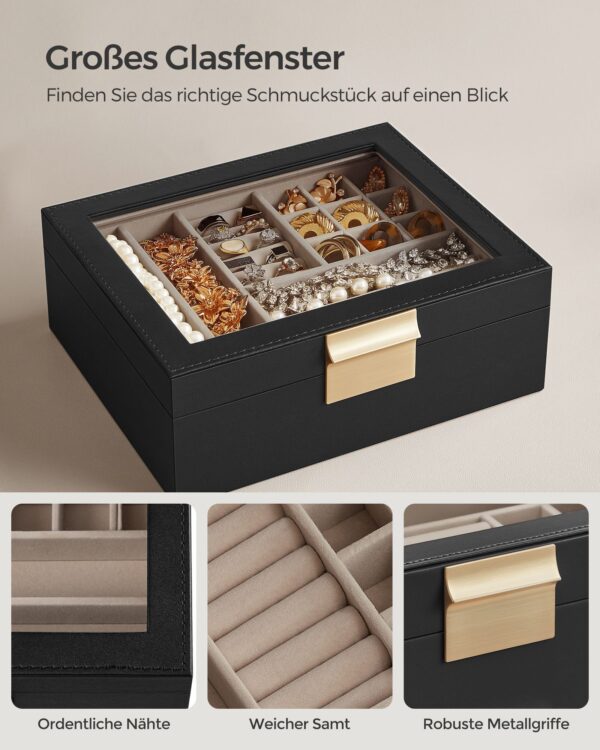 Pagaminta iš aukštos kokybės MDF (vidutinio tankio medienos plaušų plokštės), poliuretano (PU), aksomo ir stiklo, ši dėžutė yra tvirta ir ilgaamžė. Jos matmenys yra 18,5 x 23 x 8,5 cm (D x P x A), o svoris siekia 0,9 kg.