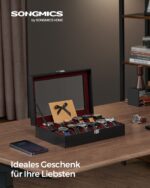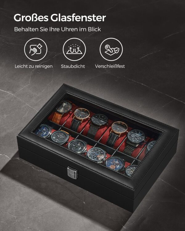 Stiklinis dangtis leidžia lengvai peržiūrėti laikrodžius, o aksominis pamušalas užtikrina jų apsaugą nuo įbrėžimų. Tai puikus pasirinkimas tiek asmeniniam naudojimui, tiek kaip dovana laikrodžių entuziastui.