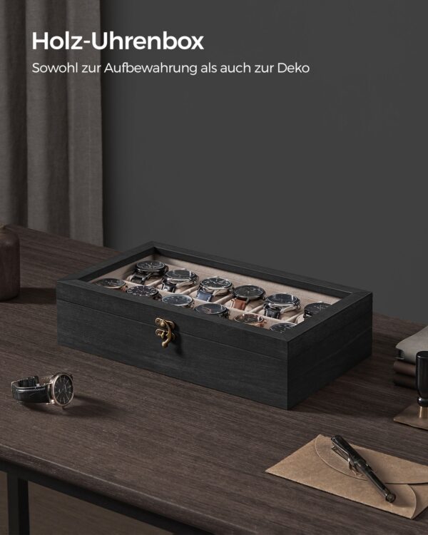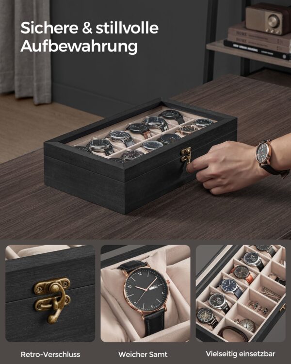 Ši elegantiška laikrodžių dėžutė yra puikus pasirinkimas jūsų laikrodžių kolekcijai saugoti ir eksponuoti. Juodmedžio juoda spalva ir smėlio akcentai suteikia prabangos ir stiliaus jūsų interjerui.