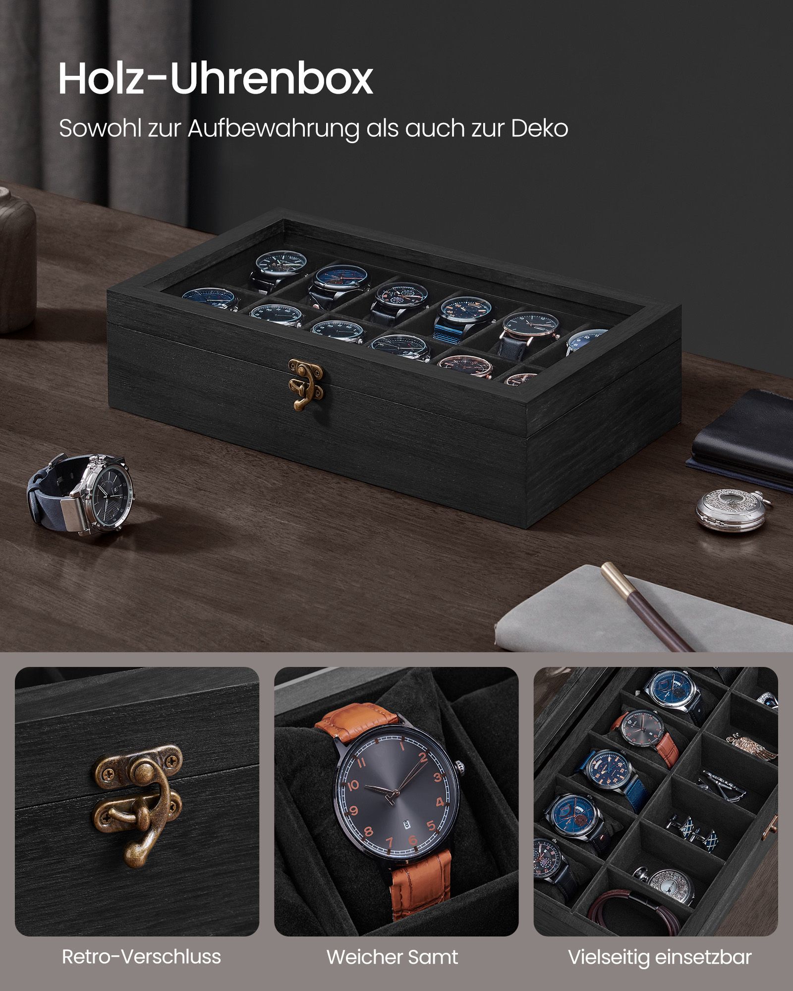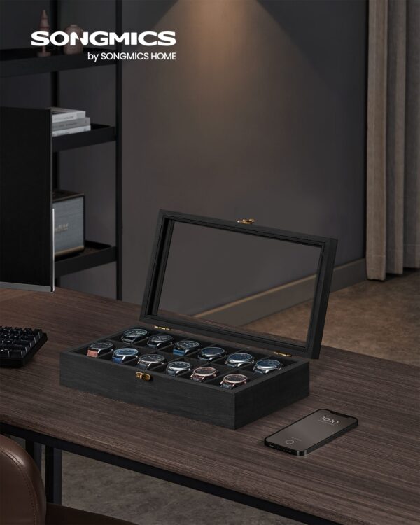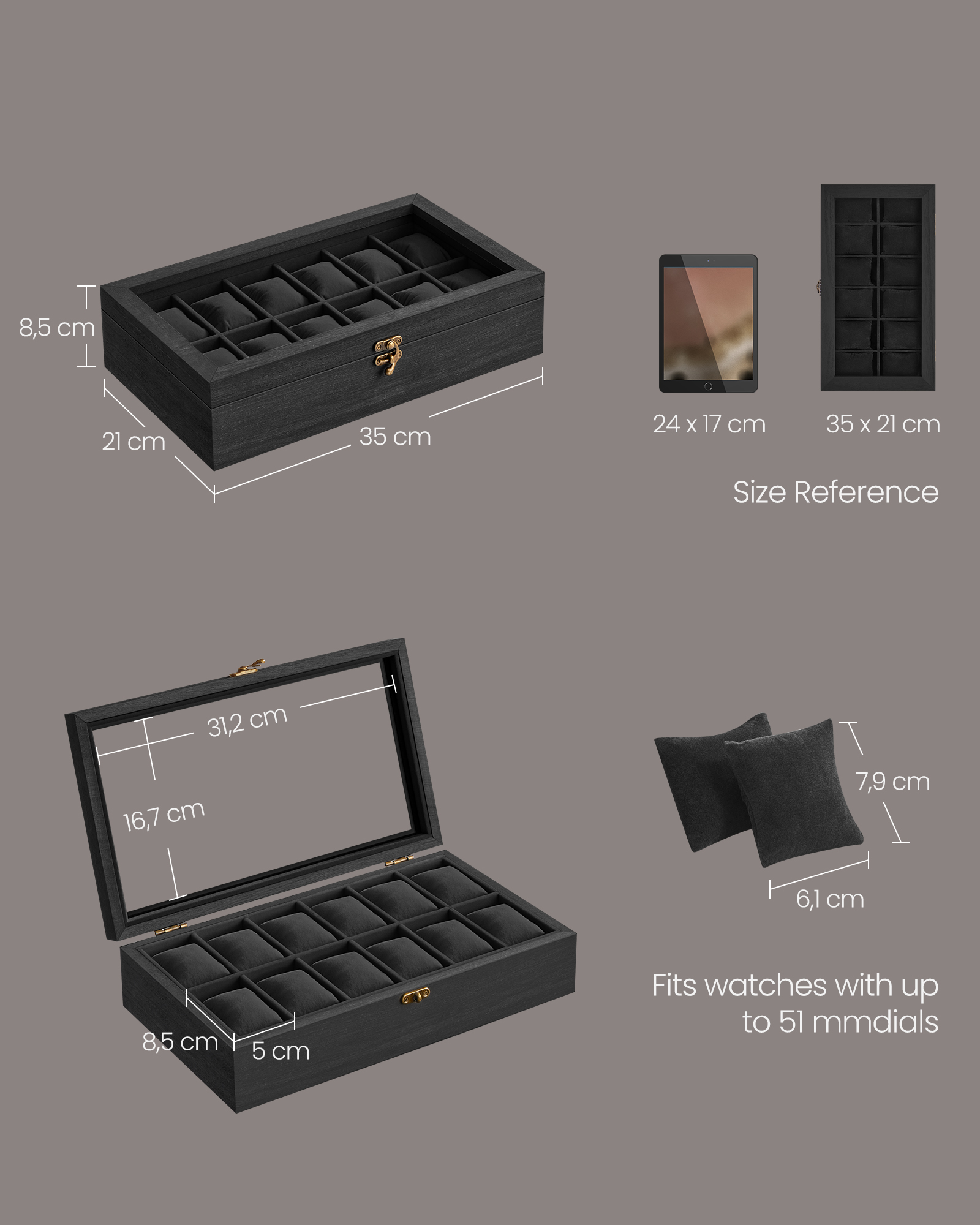 Ši laikrodžių dėžutė ne tik apsaugo jūsų laikrodžius nuo dulkių ir pažeidimų, bet ir leidžia juos patogiai laikyti bei eksponuoti.