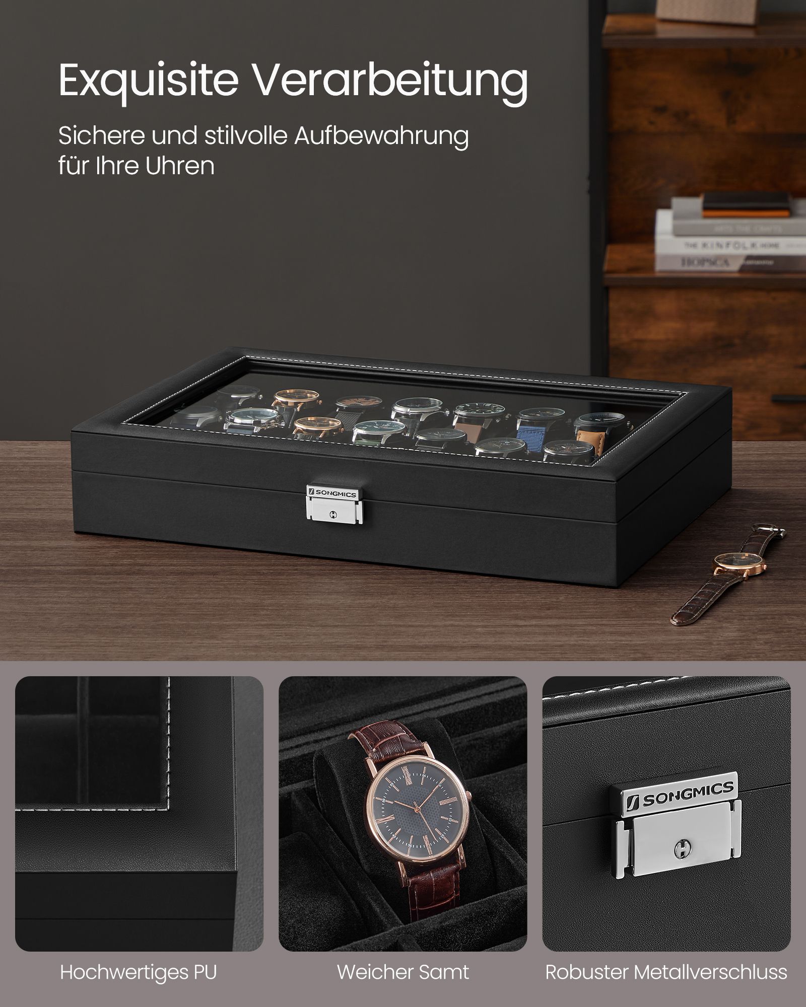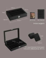 Ši laikrodžių dėžutė yra pagaminta iš aukštos kokybės medžiagų, užtikrinančių ilgaamžiškumą ir patikimumą. Rašalo juodas PU viršelis suteikia elegancijos, o aksomo pamušalas – prabangos pojūtį. Dėžutės vidus yra kruopščiai suprojektuotas, kad Jūsų laikrodžiai būtų saugiai laikomi ir apsaugoti nuo įbrėžimų.