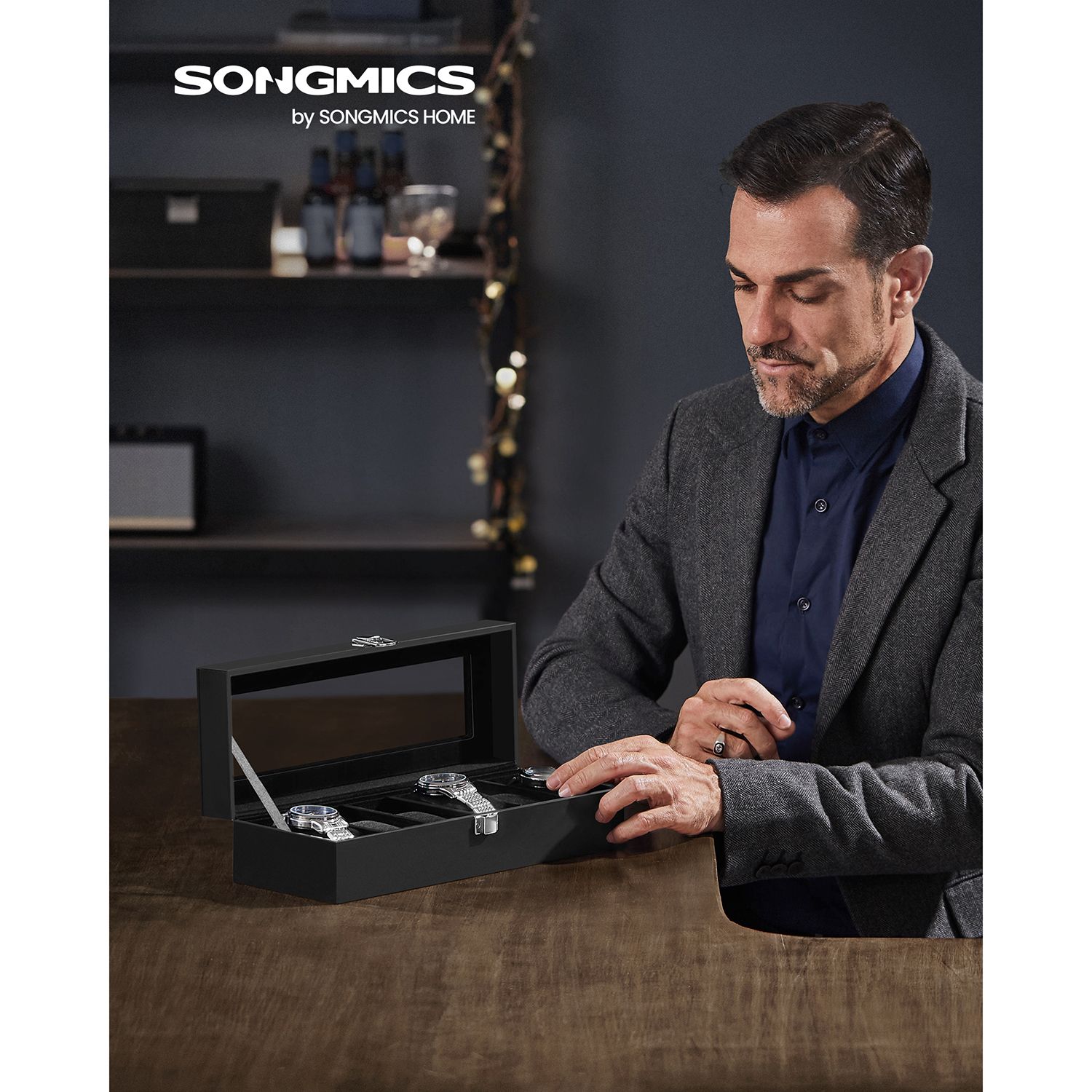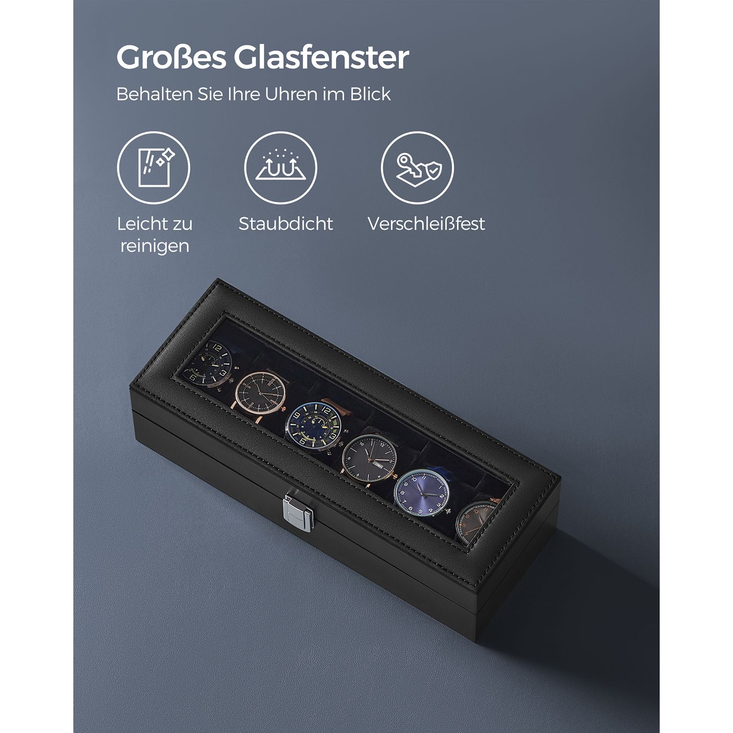 Stiklinis dangtis leidžia patogiai peržiūrėti laikrodžius, o aksominis pamušalas apsaugo juos nuo įbrėžimų ir pažeidimų. Tai puikus sprendimas tiek namuose, tiek kelionėse.