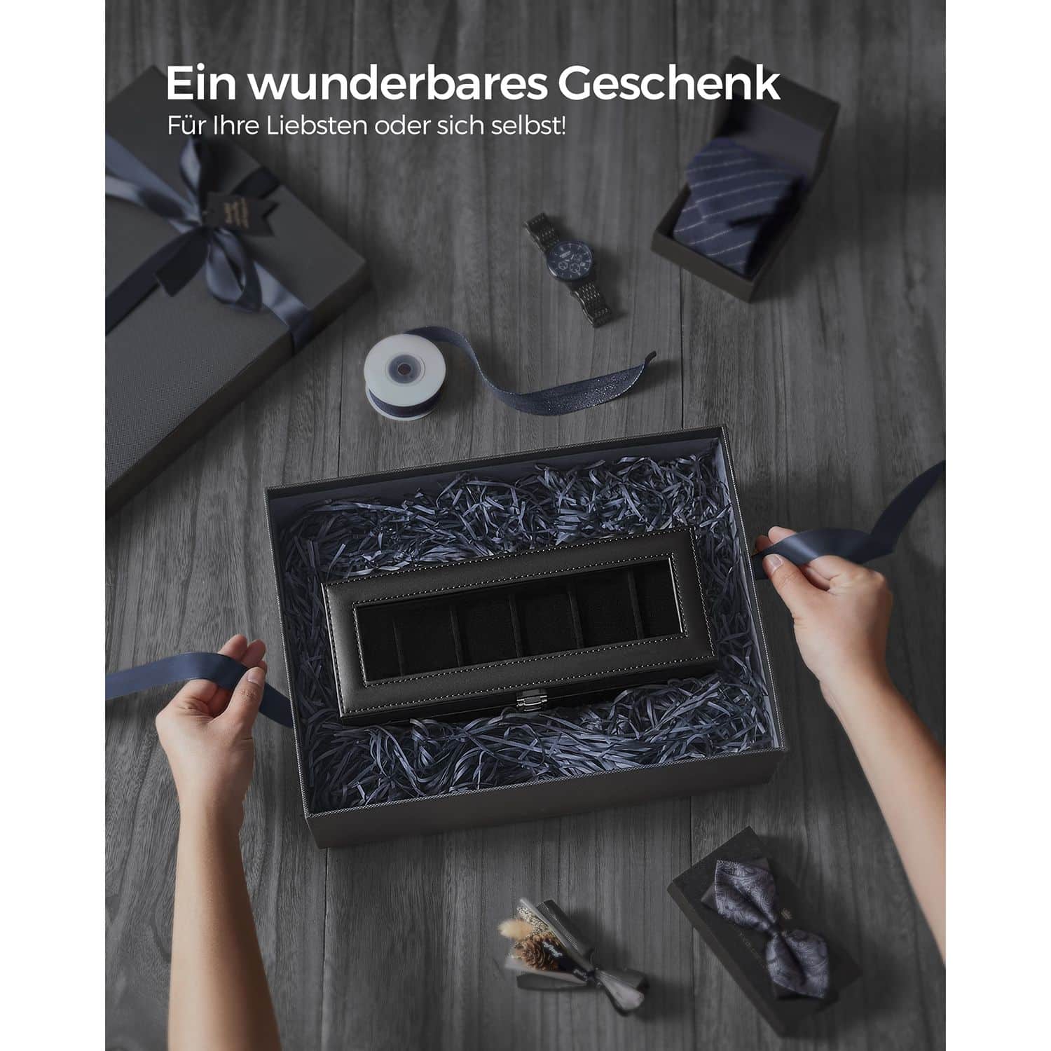 Ši elegantiška laikrodžių dėžutė, skirta 6 laikrodžiams, yra puikus pasirinkimas tiems, kurie vertina stilių ir funkcionalumą. Juodos spalvos PU danga ir aksominis pamušalas suteikia prabangos pojūtį, omedžio dulkių plokštė (MDF) konstrukcija užtikrina ilgaamžiškumą.