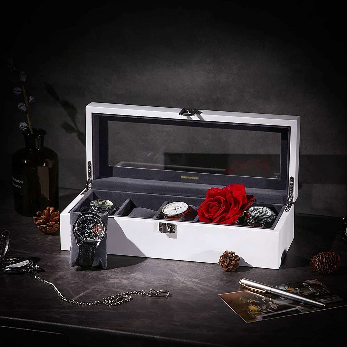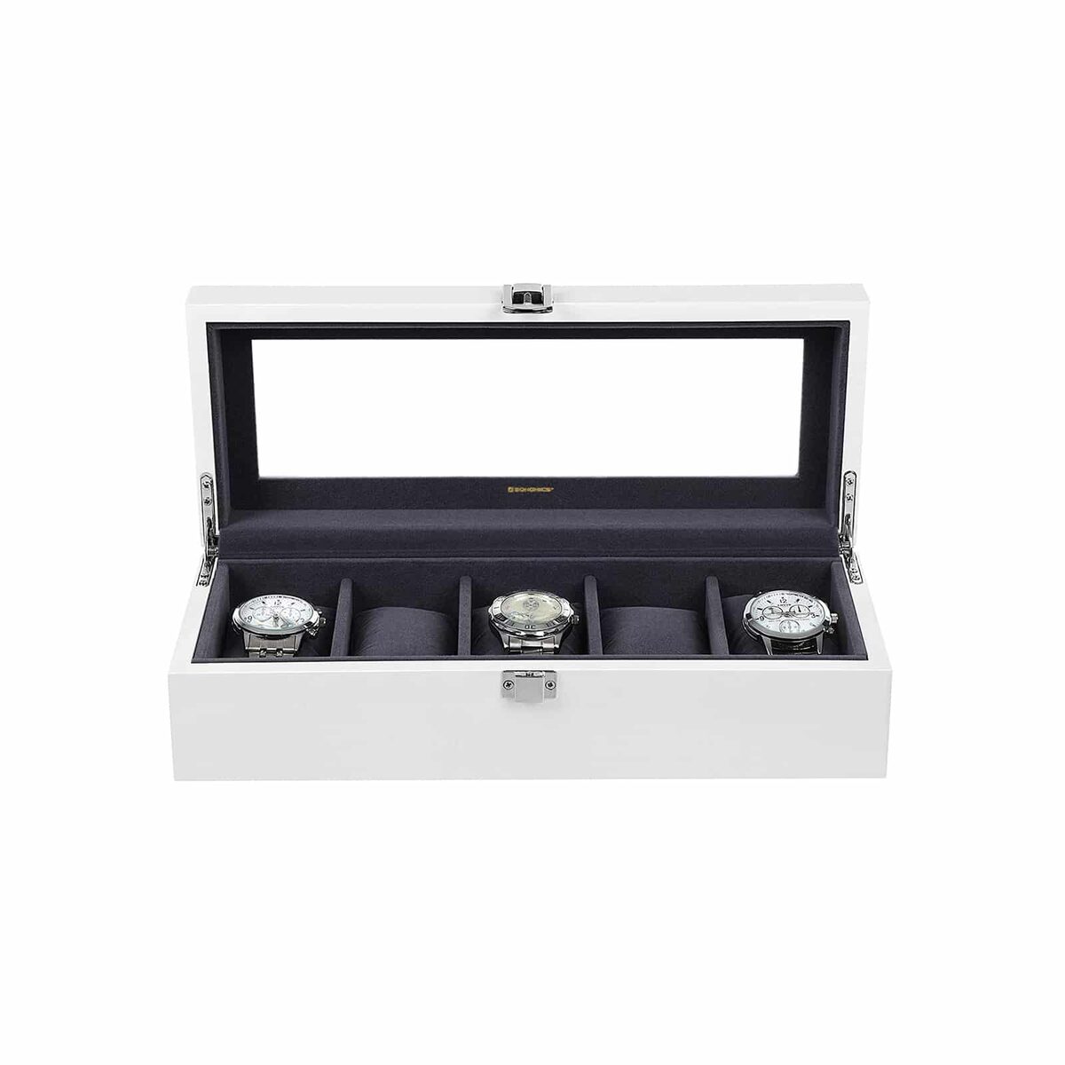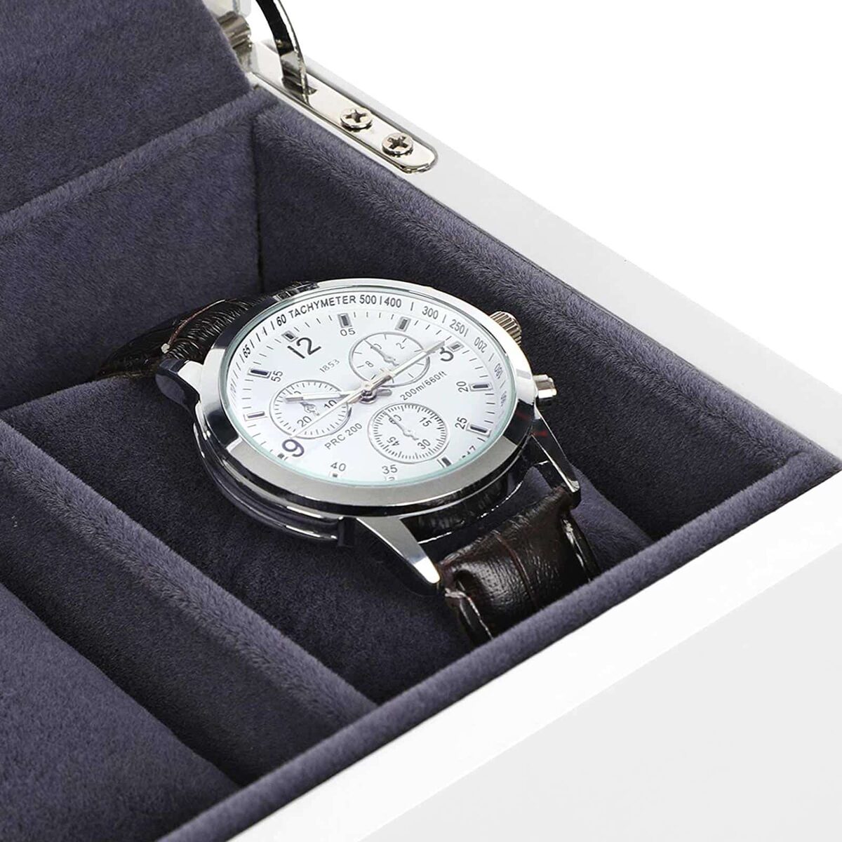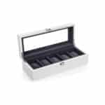 Įdėkite laikrodžius į 5 šios dėžutės skyrelius ir suteikite jiems puikią visapusišką apsaugą. Laikrodžių dėžutė ne tik apsaugo jūsų brangius laikrodžius nuo nešvarumų, įbrėžimų ir pažeidimų, bet ir yra stilinga jūsų kambario puošmena. Įsigykite šią laikrodžių dėžutę, nepasigailėsite!