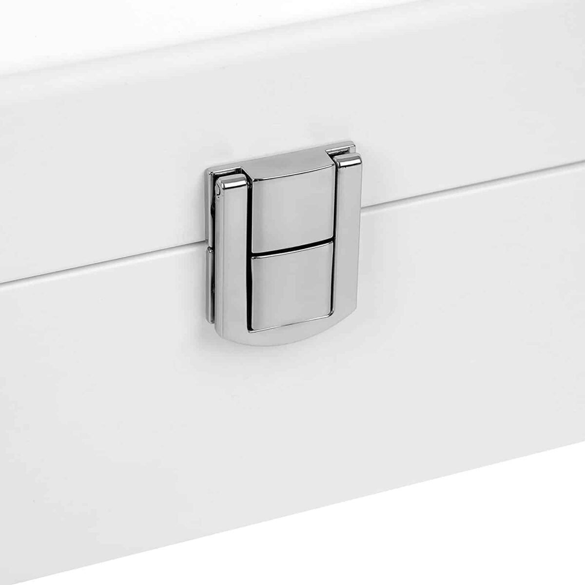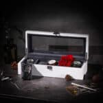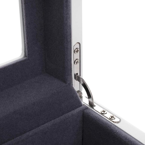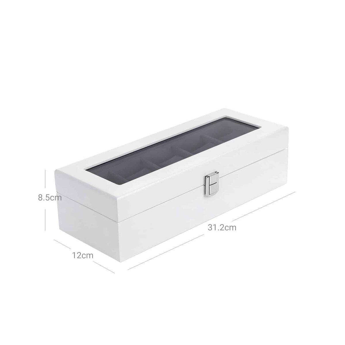 Paprastas, bet elegantiškas ir praktiškas pilkos spalvos aksominis pamušalas bei baltas dangtelis – šis spalvų derinys suteikia laikrodžių dėžutei iš medžio dulkių plokštė (MDF) elegantišką ir klasikinę išvaizdą. Be to, vyriai ir metalinis užsegimas suteikia šiai dėžei šiek tiek blizgesio ir užtikrina patogų naudojimą.