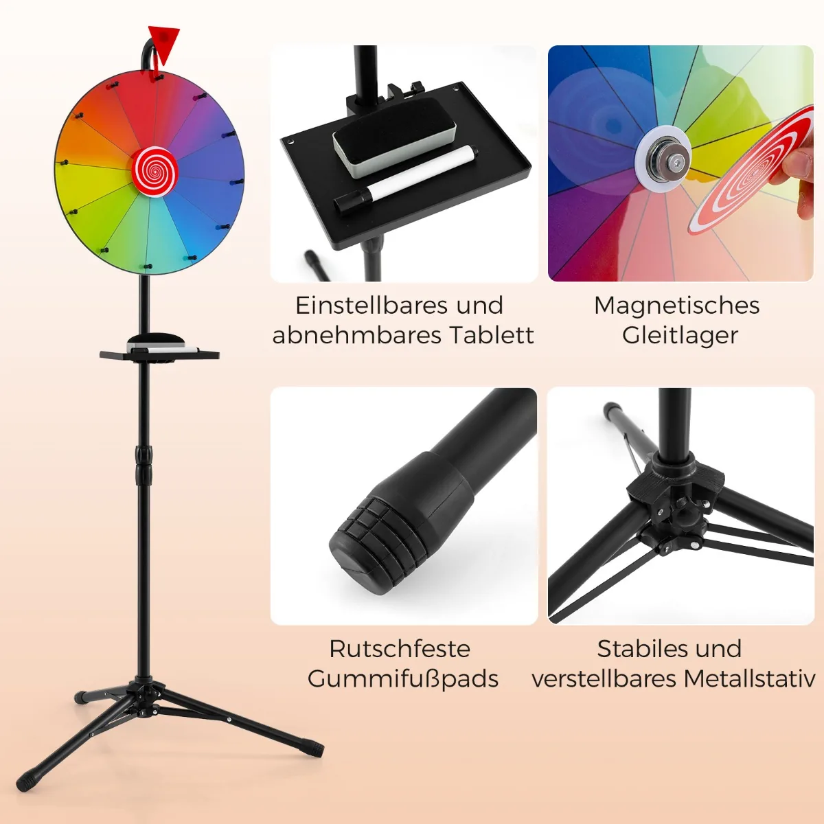 Laimės ratas su stovu 40×155 cm – universalus renginių aksesuaras, tinkantis mugėms, karnavalams, vakarėliams ir reklaminėms akcijoms. Ratas turi 12 pritaikomų spalvotų segmentų, kuriuose galima išdėstyti logotipus ar tekstą, bei daugkartinę rašymo lentą su sauso trynimo žymekliu. Reguliuojamo aukščio stovas ir tvirtas metalinis trikojis užtikrina stabilumą ir patogų naudojimą skirtingose erdvėse.