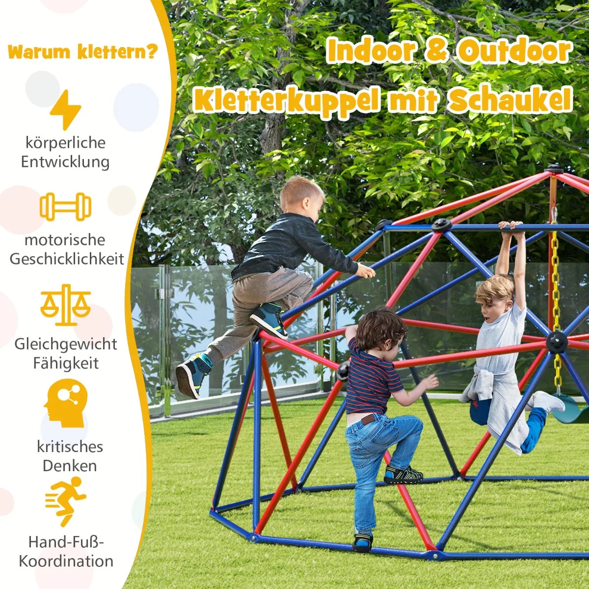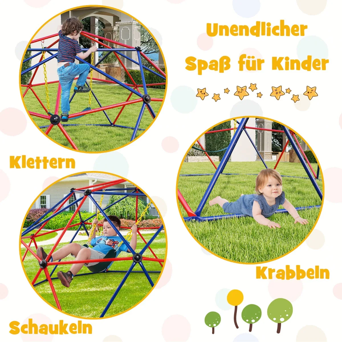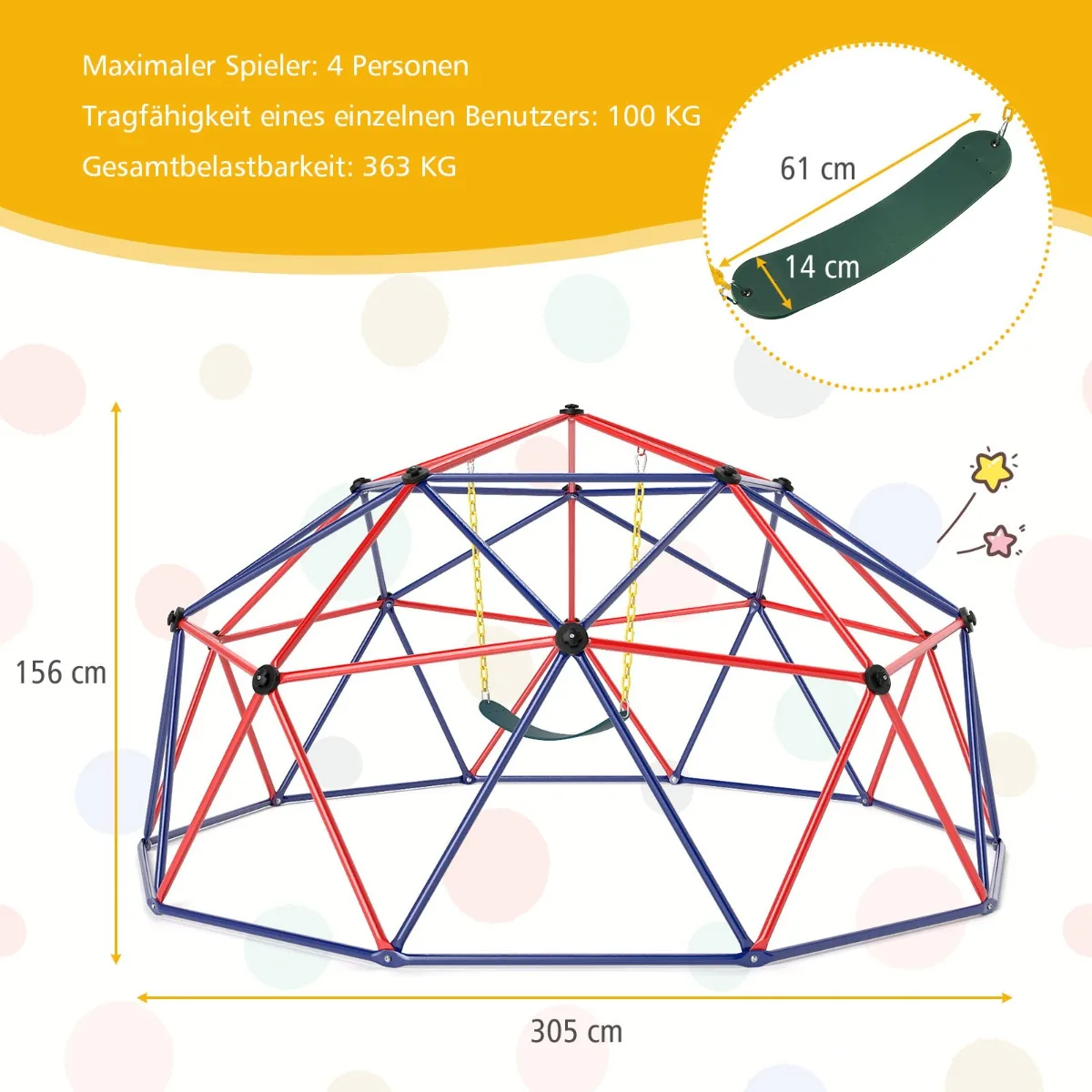 Laipiojimo kupolas 305x305x156cm su sūpynėmis yra puikus lauko ir vidaus žaidimų aikštelės elementas vaikams. Šis kupolas leidžia vaikams lavinti motoriką, pusiausvyrą ir koordinaciją per aktyvų žaidimą su draugais.
