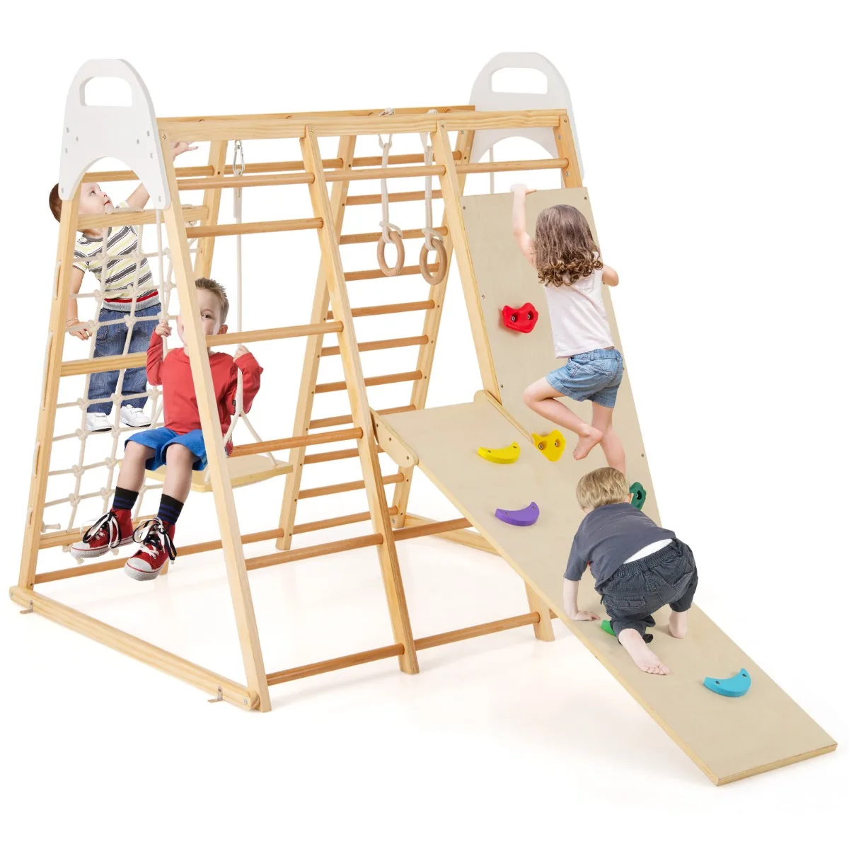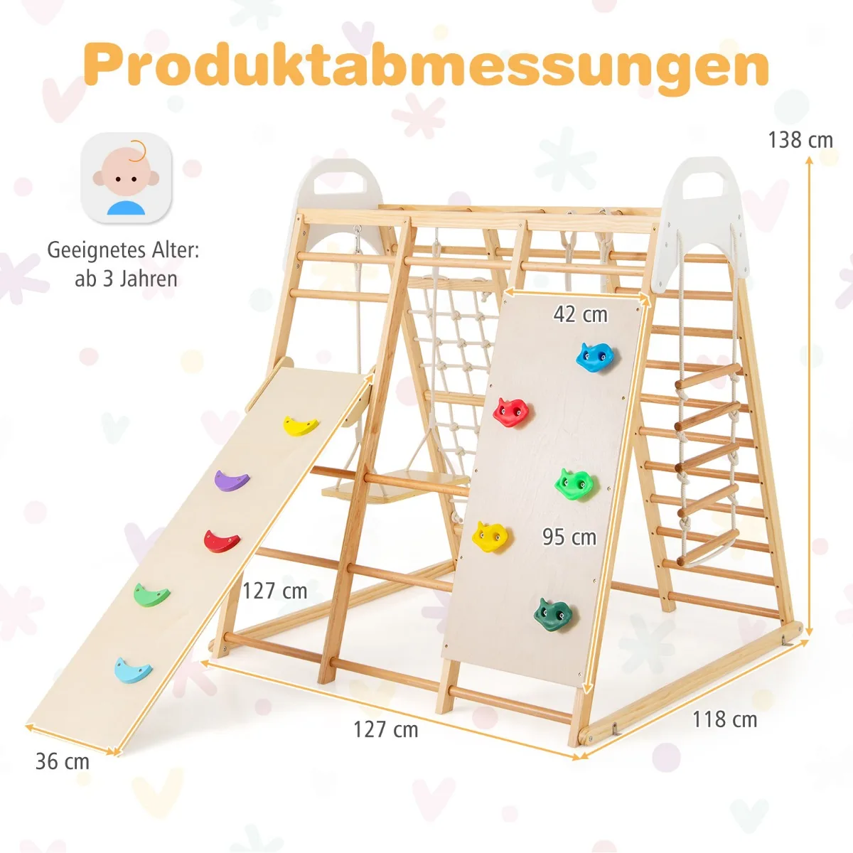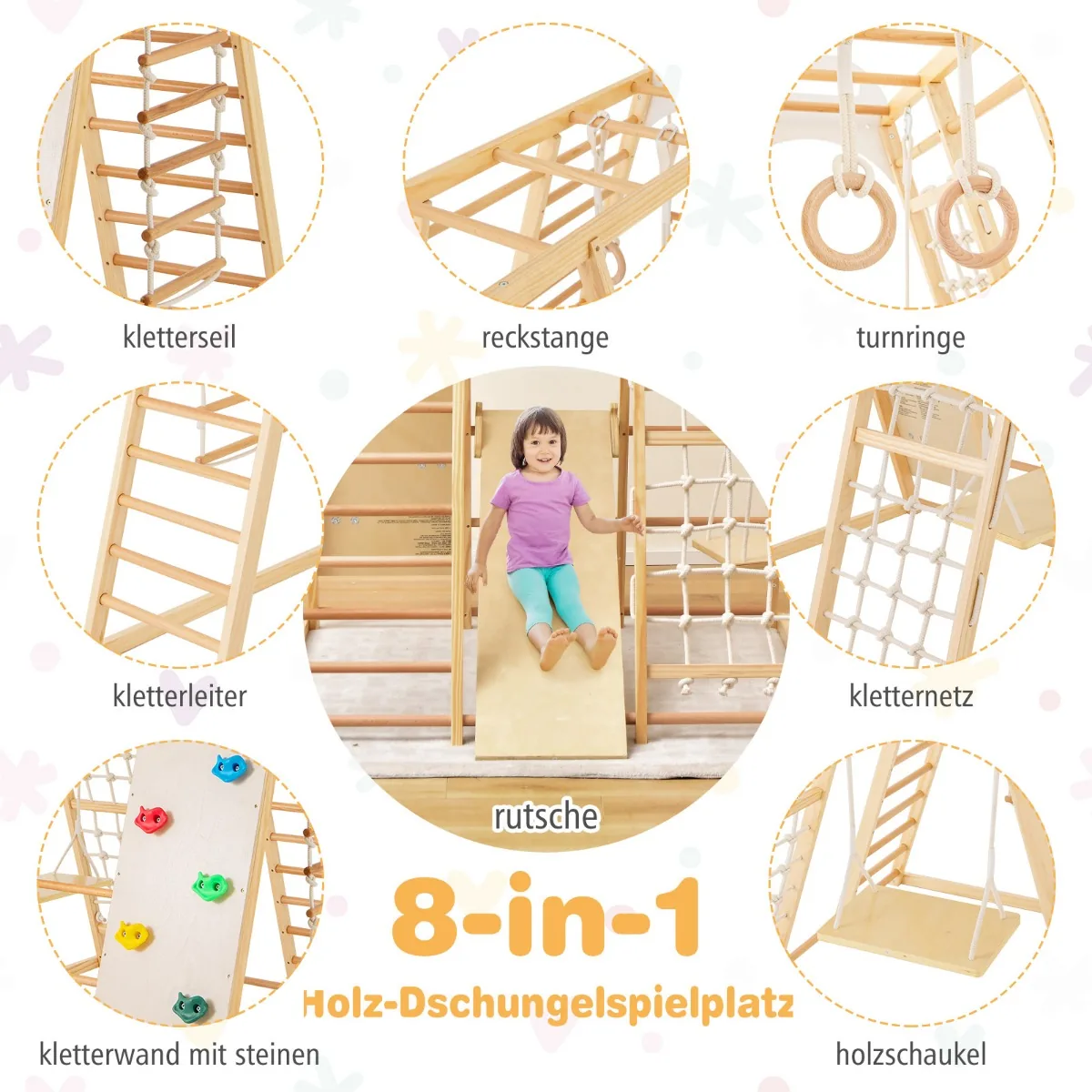 - 8-in-1 žaidimų rinkinys: laipiojimo rėmas, gimnastikos žiedai, laipiojimo kopėčios, laipiojimo tinklas, čiuožykla, virvinės kopėčios, laipiojimo uola ir medinės sūpynės.